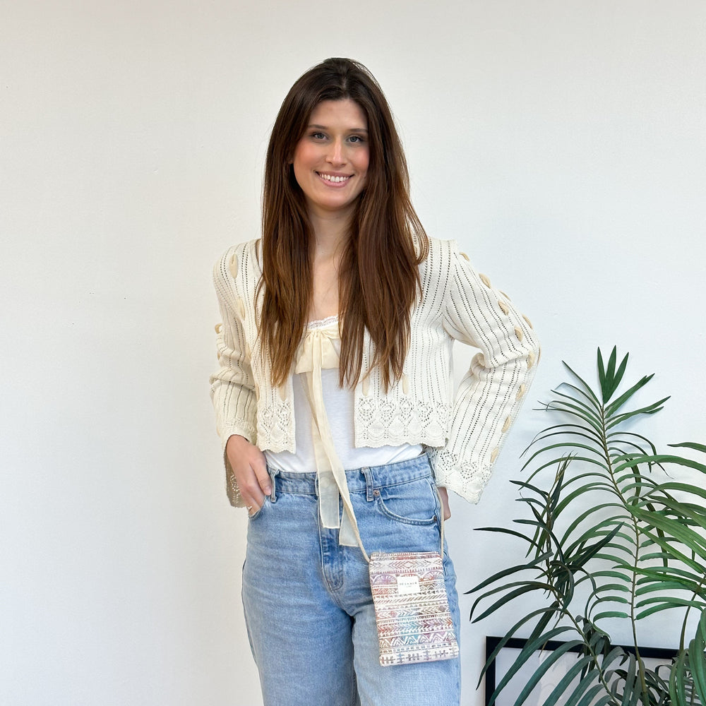 Bolsito porta móvil para llevar tipo bandolera, con cremallera en la parte superior y cordón largo de algodón de color beige. Con tejido con estampado étnico multicolor. Cada articulo puede tener una variación en el estampado, dependiendo de donde se haya efectuado el corte de la pieza. Forrado de tejido grueso de color gris en la parte interior. Para su correcto mantenimiento se aconseja lavarlo en frío a mano y no utilizar secadora.