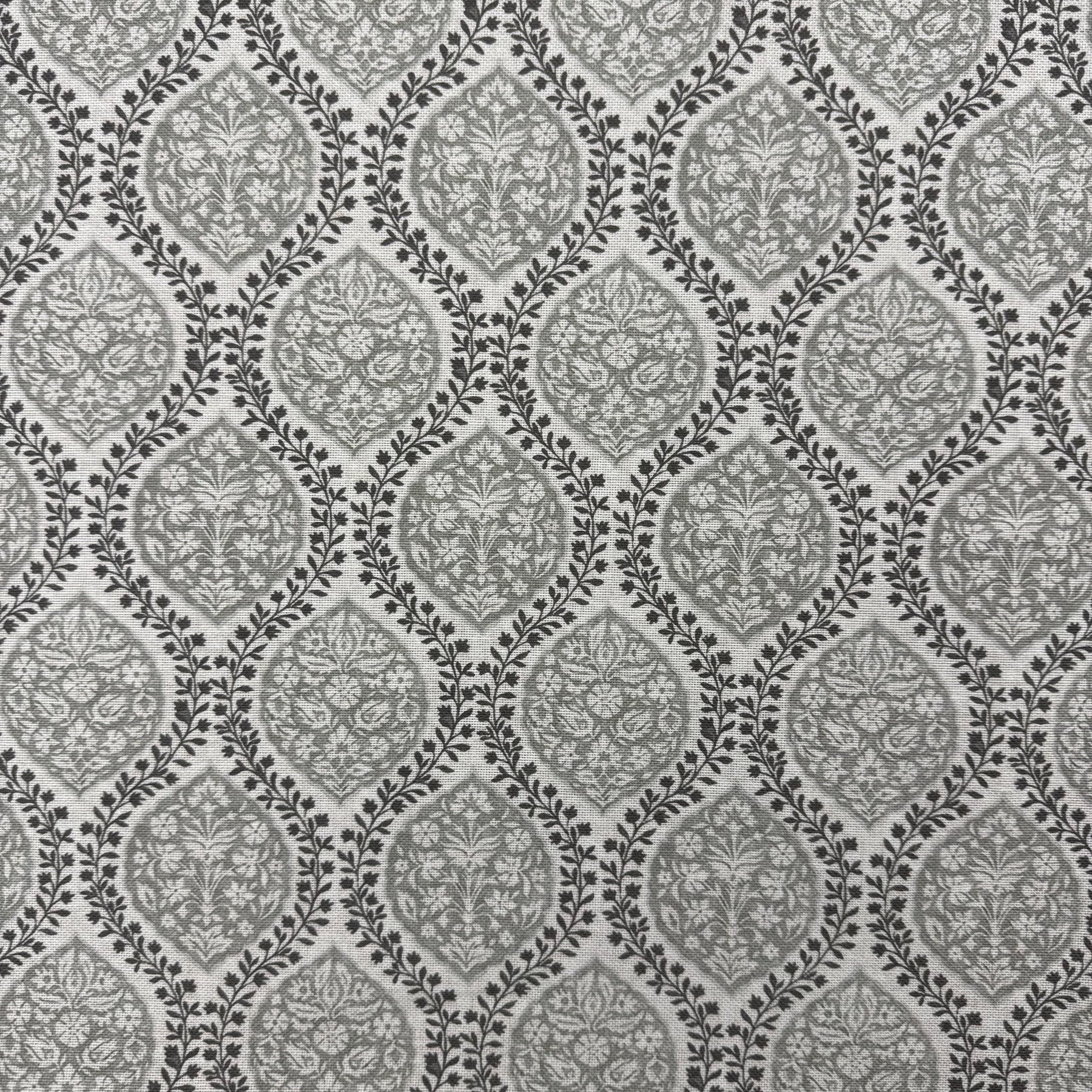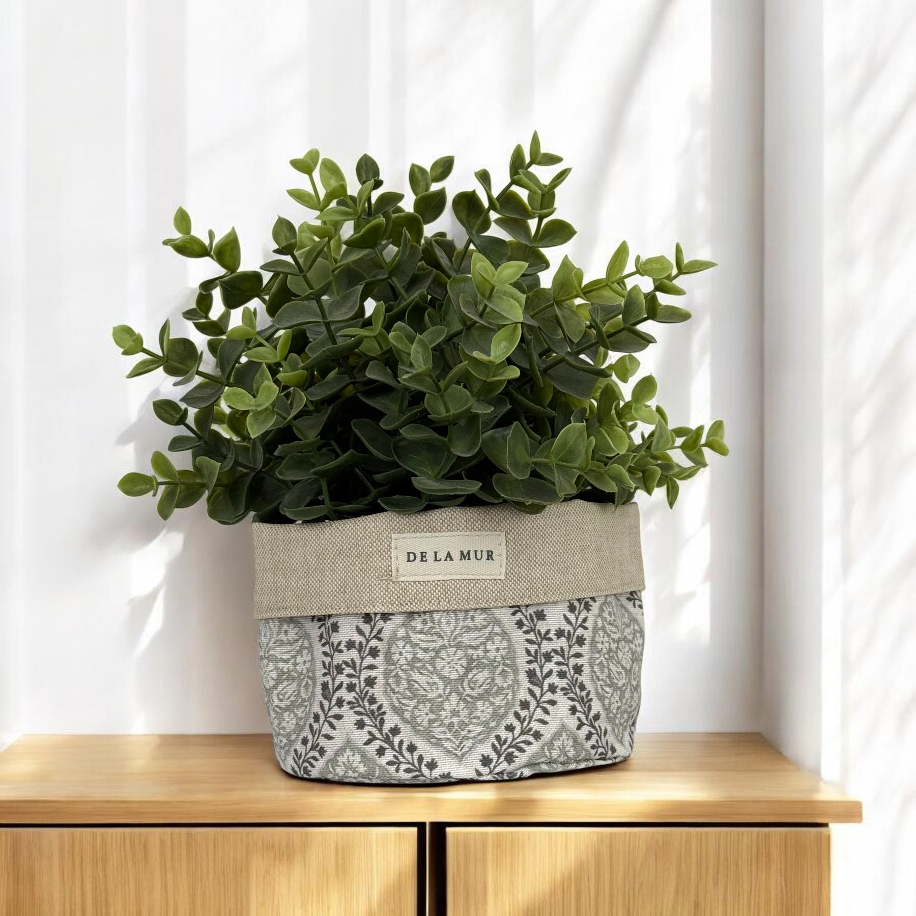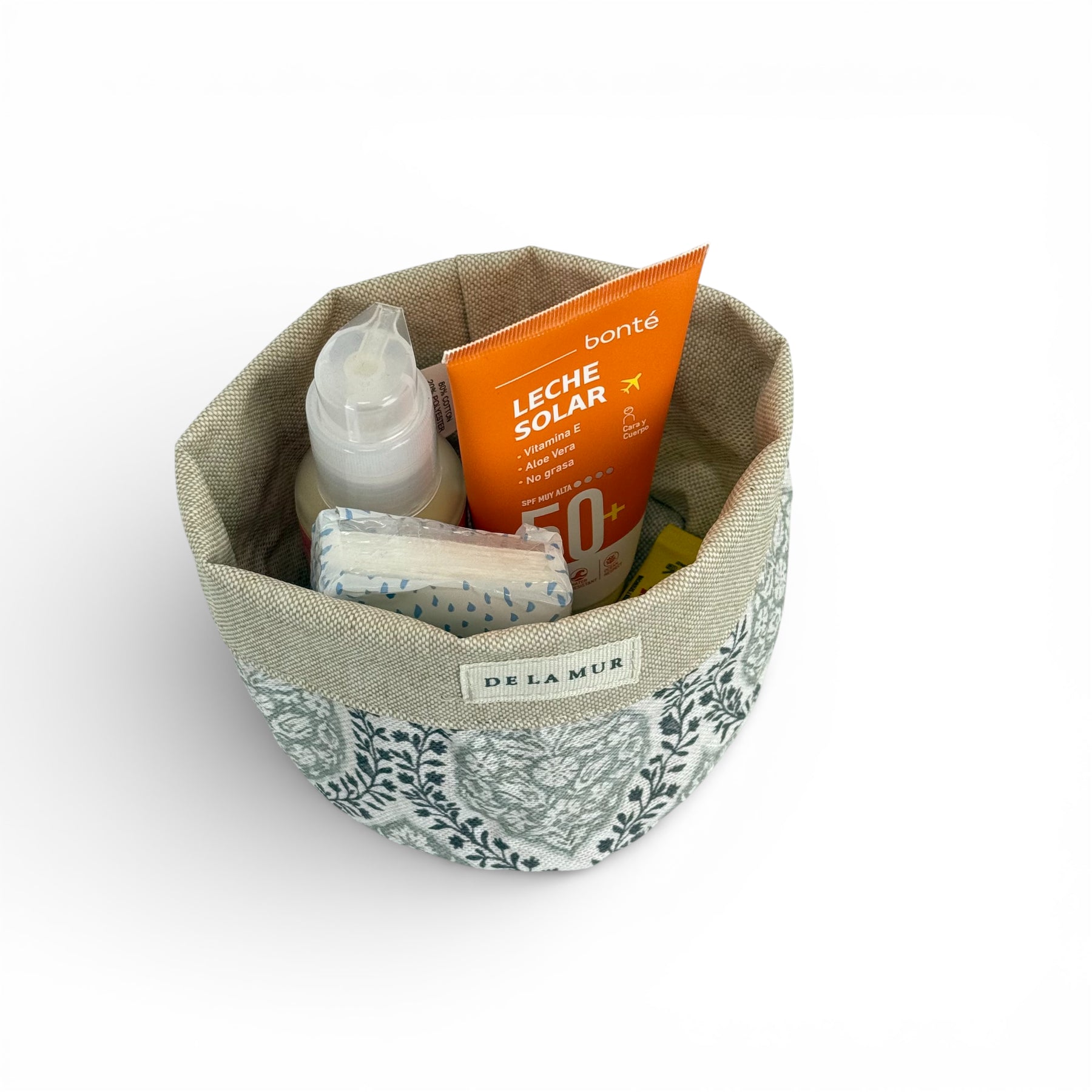 Cesta pequeña multiusos confeccionada en tejido fino de half-panama 80% algodón y 20% poliéster, con estampado geométrico gris en el exterior. El interior está realizado en tejido beige resinado, ideal para aportar mayor resistencia y practicidad en el uso diario.