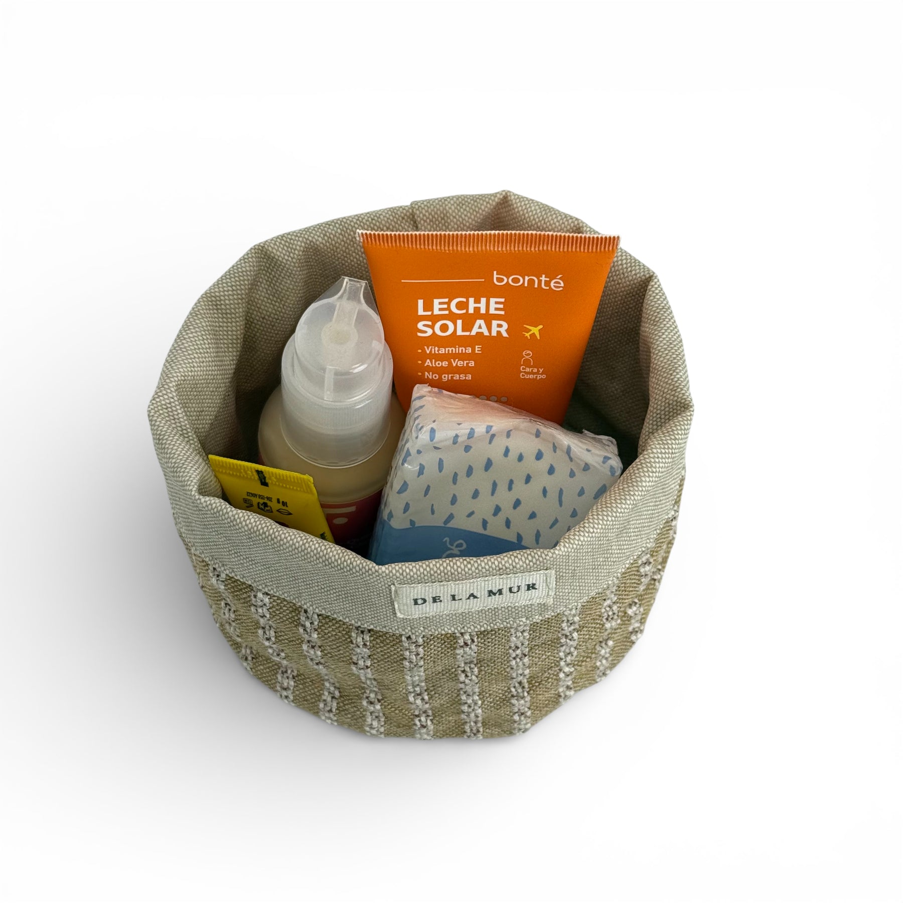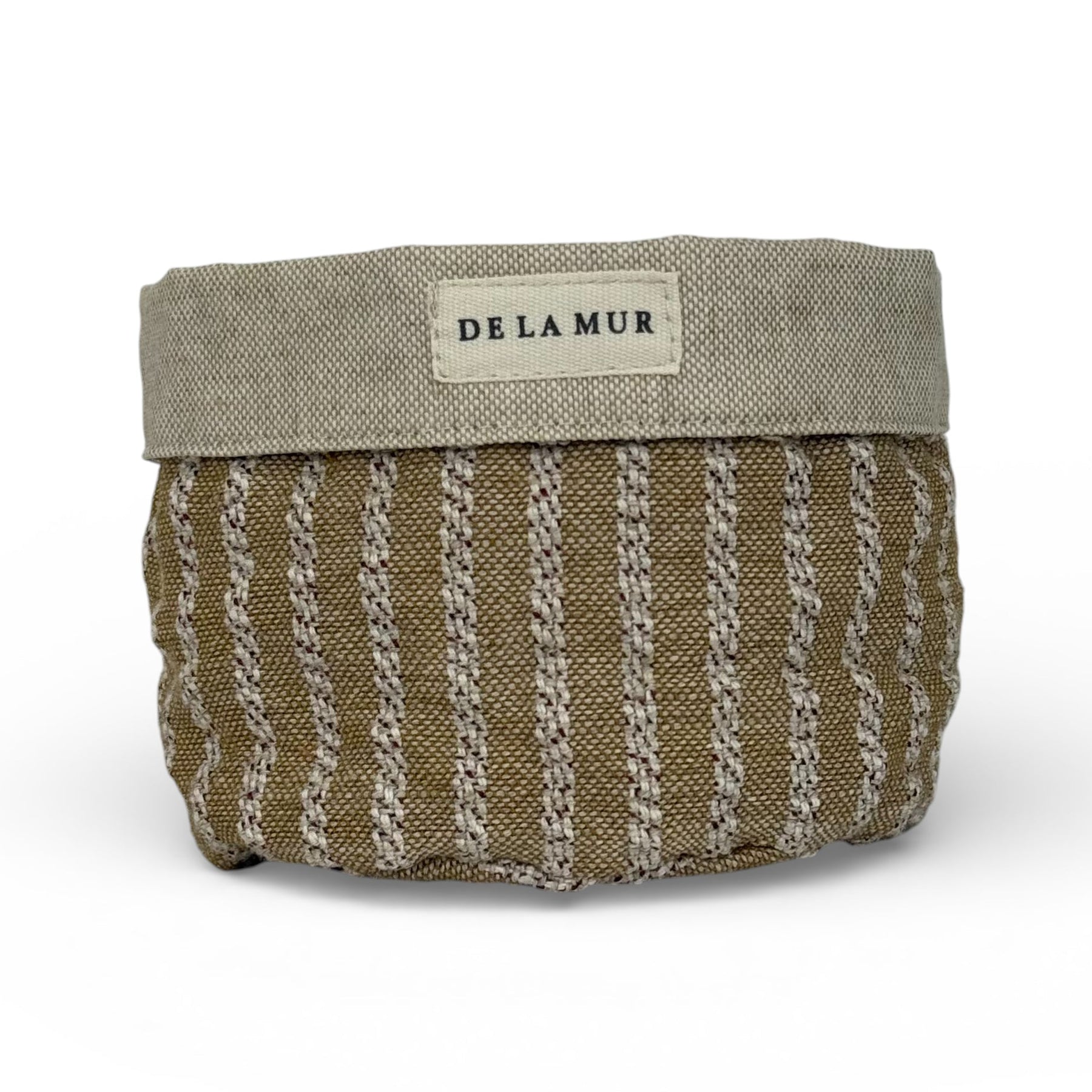 Cesta pequeña multiusos confeccionada en tejido fino con relieve 80% algodón y 20% poliéster, con estampado a rayas beige en el exterior. El interior está realizado en tejido beige resinado, ideal para aportar mayor resistencia y practicidad en el uso diario.