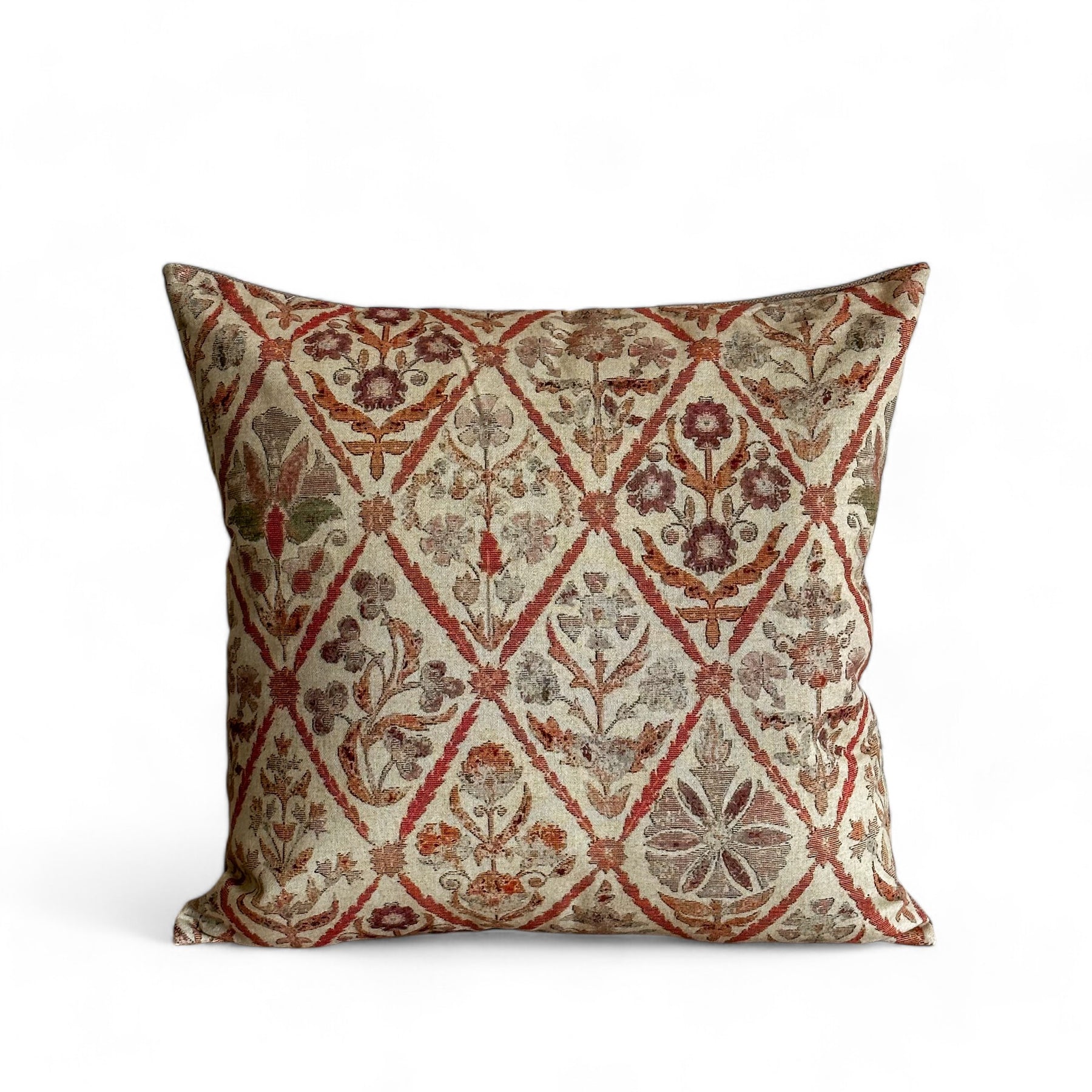 Funda de cojín sin relleno. Combinado con dos tejidos diferentes, un tejido fino con estampado floral en tonos beige y caldera por una cara, y un tejido liso tipo saco de color tierra por la otra. Para su correcto mantenimiento se aconseja lavarlo en frío y no utilizar secadora.