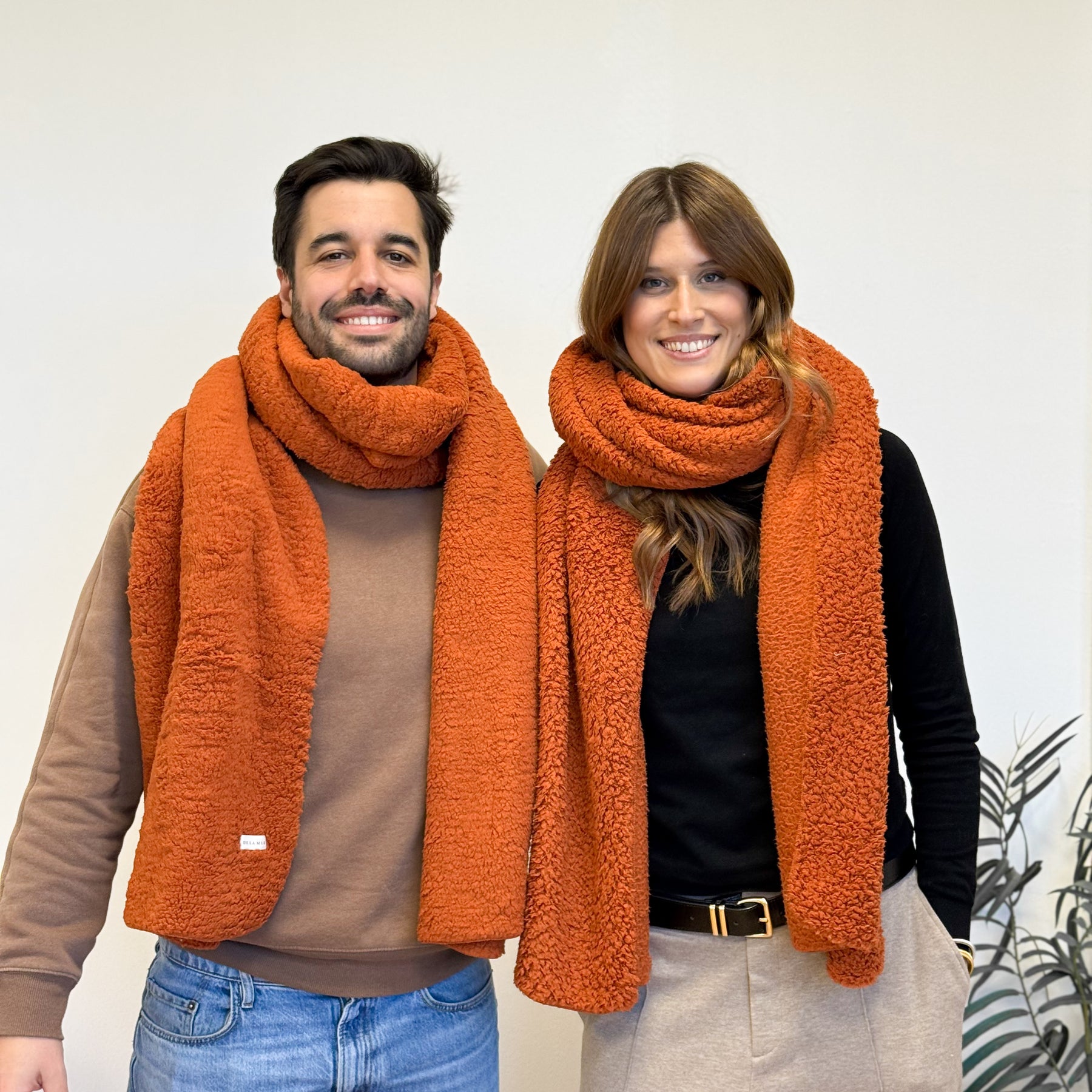 Bufanda grande con tejido grueso de borreguito de color teja, suave y cálido.  Para su correcto mantenimiento se aconseja lavarlo en frío y no utilizar secadora.