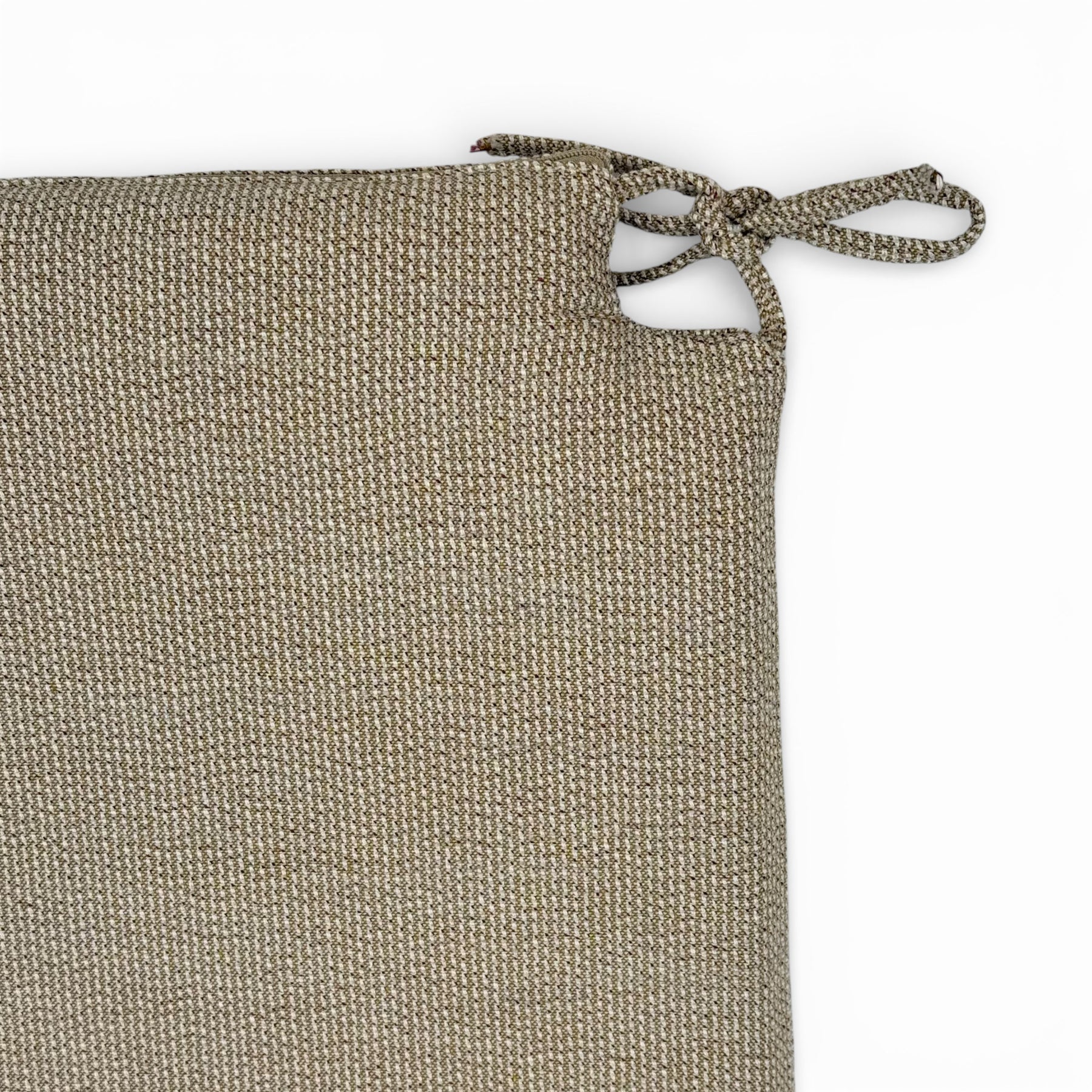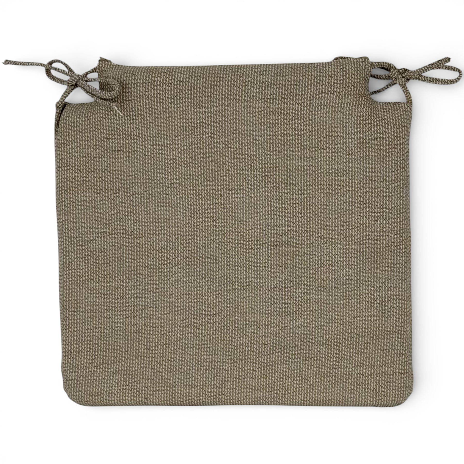 Cojín cuadrado para silla con encajes, relleno incluido y cintas para atarlo fácilmente. Está confeccionado en tejido fino con relieve 80% algodón y 20% poliéster, de gran calidad, de color beige, que aportan luz y calidez.