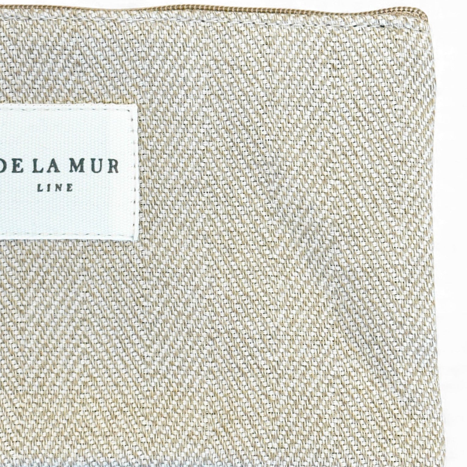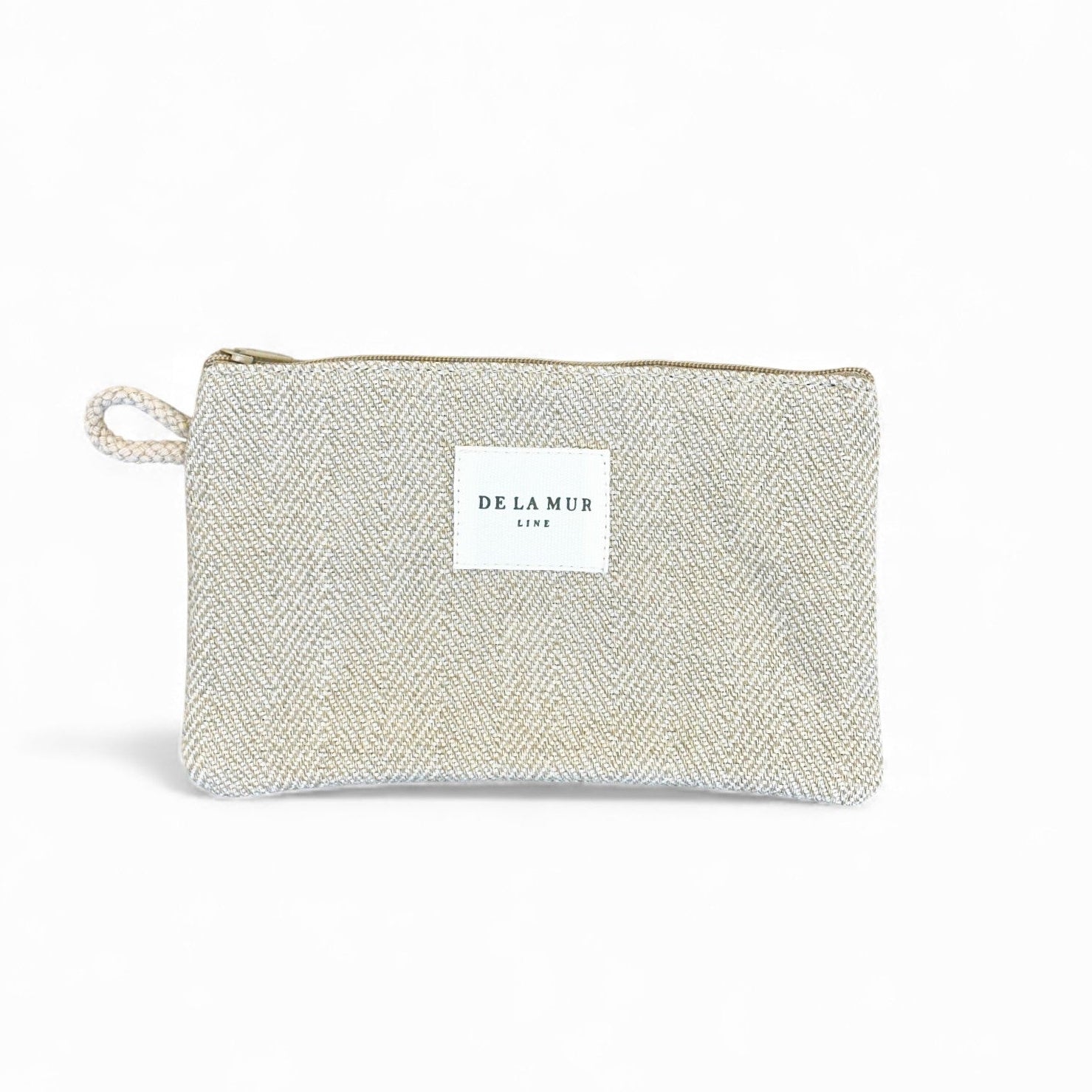 Mini neceser con cremallera en la parte superior y pequeña asa de cordón de color beige en el lateral. Con tejido grueso de toldo con estampado tipo espiga de color beige. Cada articulo puede tener una variación en el estampado, dependiendo de donde se haya efectuado el corte de la pieza. Forrado de tejido grueso de color gris en la parte interior. Para su correcto mantenimiento se aconseja lavarlo en frío a mano y no utilizar secadora.