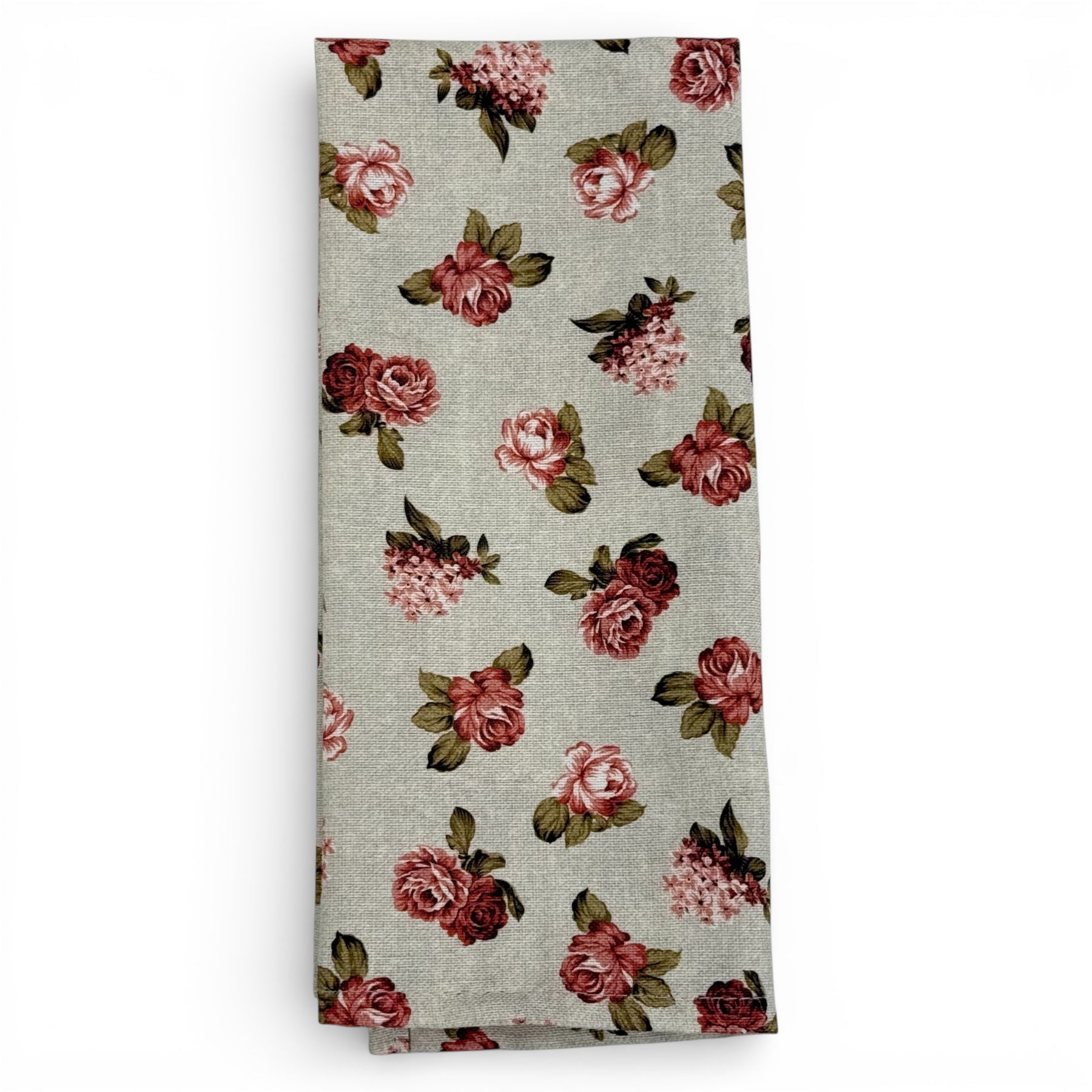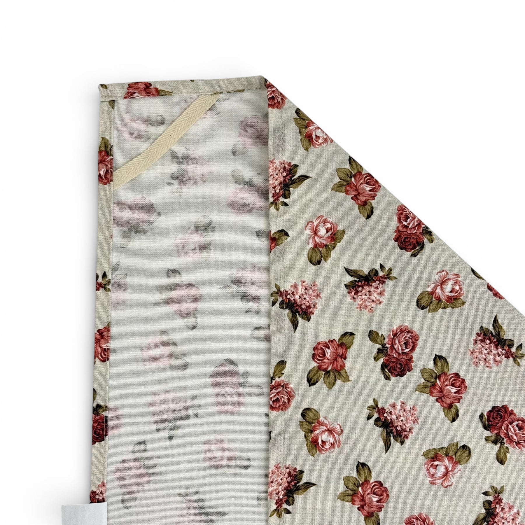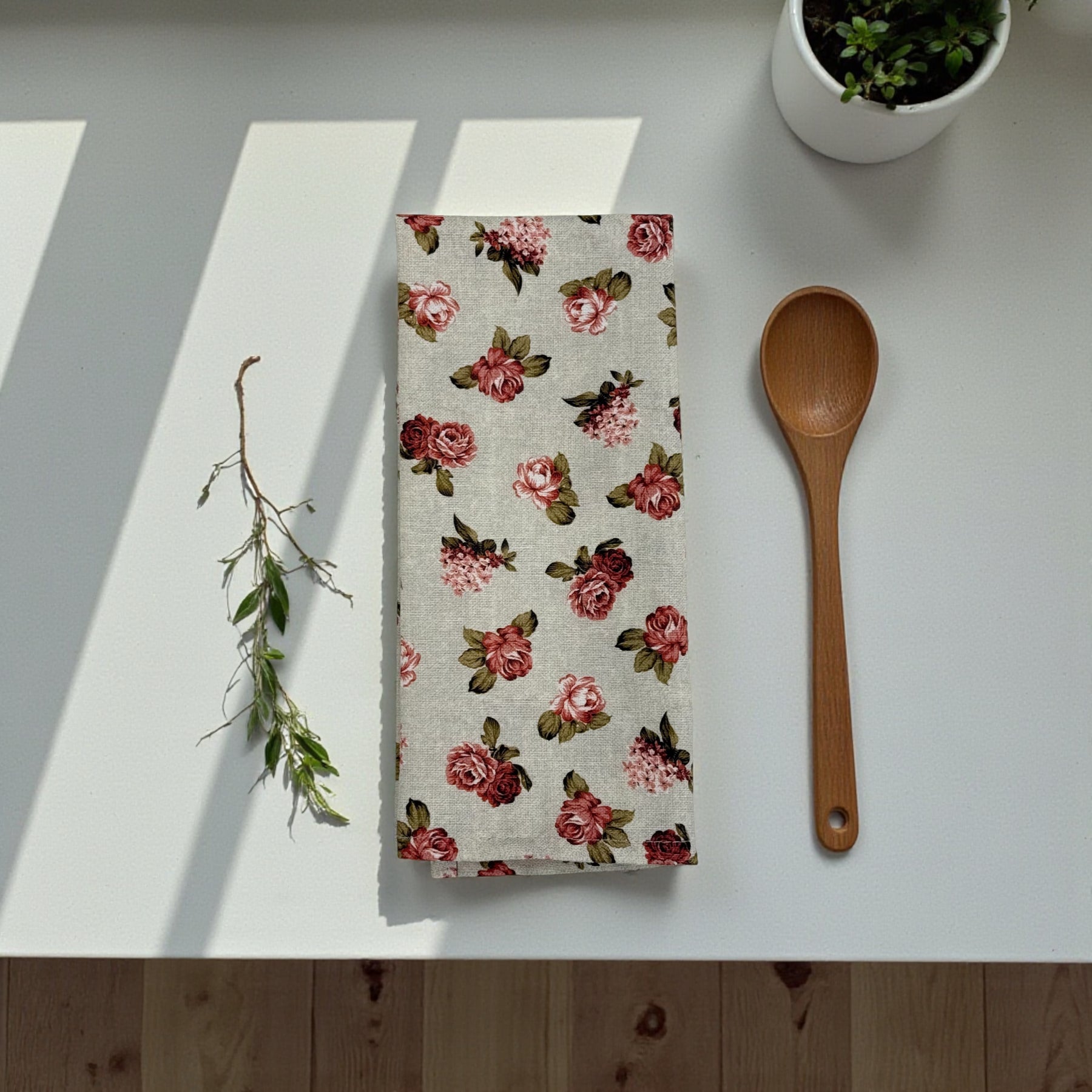 Paño de cocina con tira trasera para poder colgarlo, confeccionado en tejido fino de half-panama 80% algodón y 20% poliéster, con estampado floral rosado. Ligero, práctico y pensado para acompañarte en el día a día de la cocina con un toque bonito y delicado.