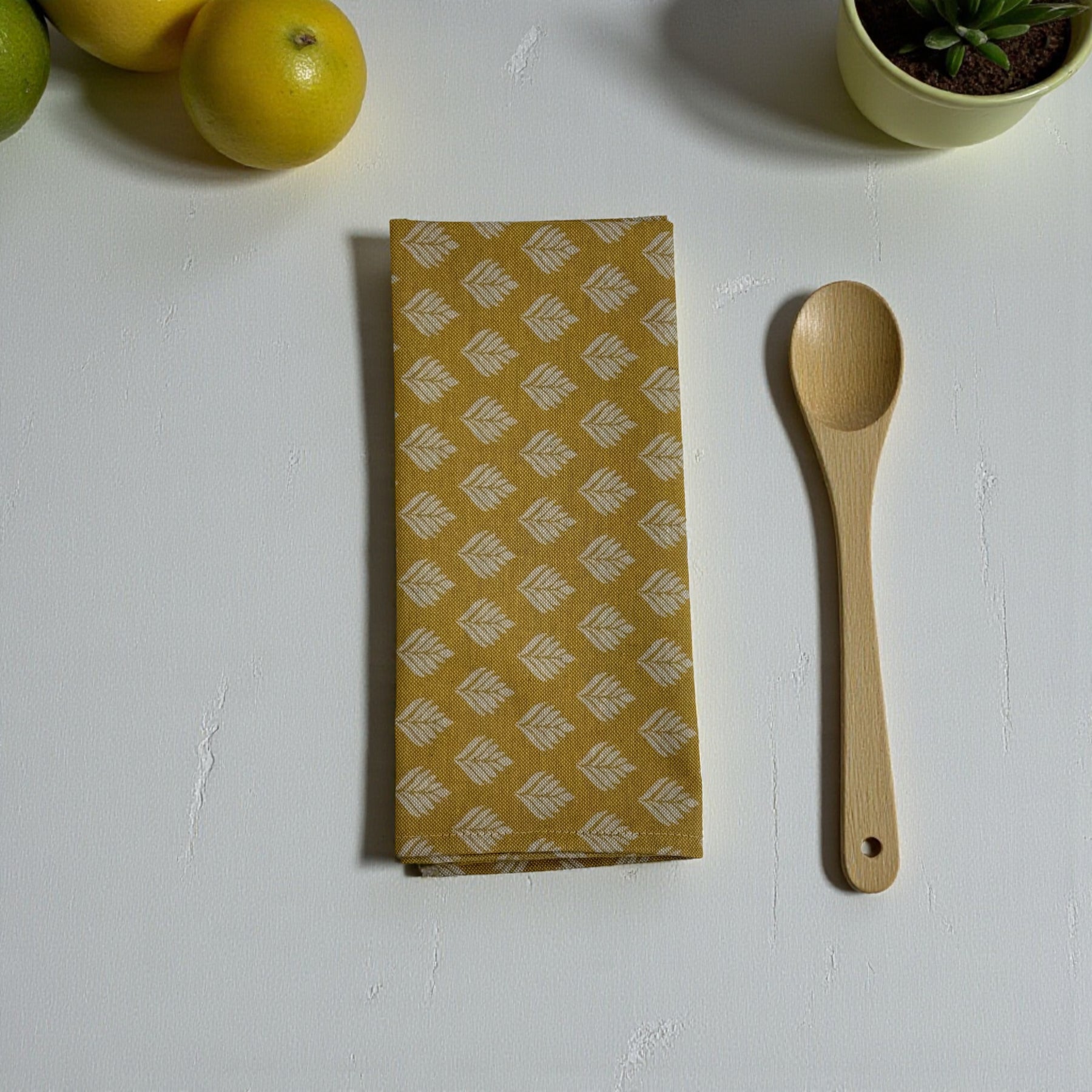 Paño de cocina con tira trasera para poder colgarlo, confeccionado en tejido fino de half-panama 80% algodón y 20% poliéster, con estampado floral mostaza. Ligero, práctico y pensado para acompañarte en el día a día de la cocina con un toque bonito y delicado.