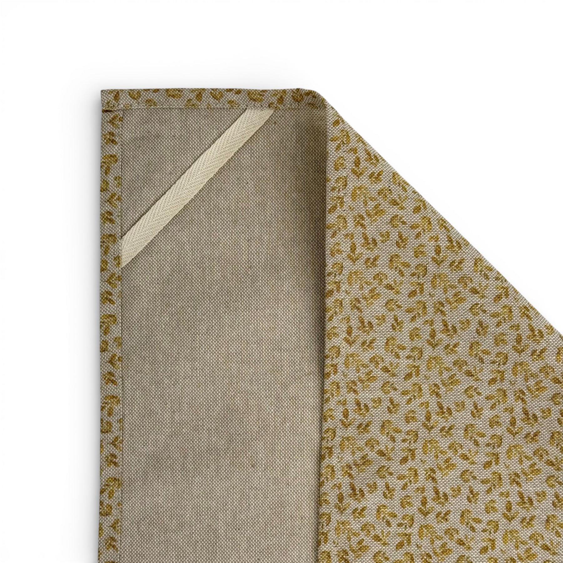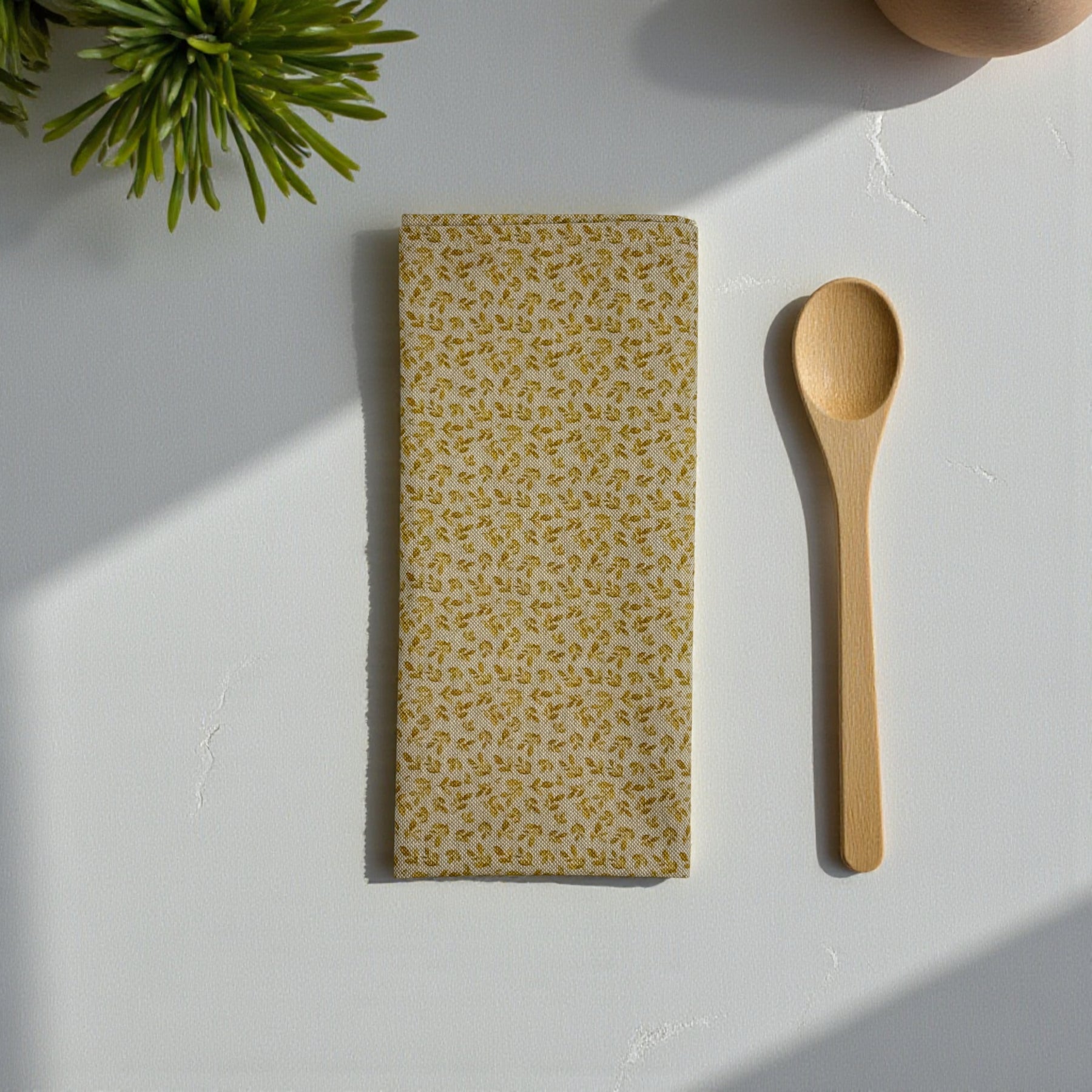 Paño de cocina con tira trasera para poder colgarlo, confeccionado en tejido fino de half-panama 80% algodón y 20% poliéster, con estampado floral mostaza. Ligero, práctico y pensado para acompañarte en el día a día de la cocina con un toque bonito y delicado.