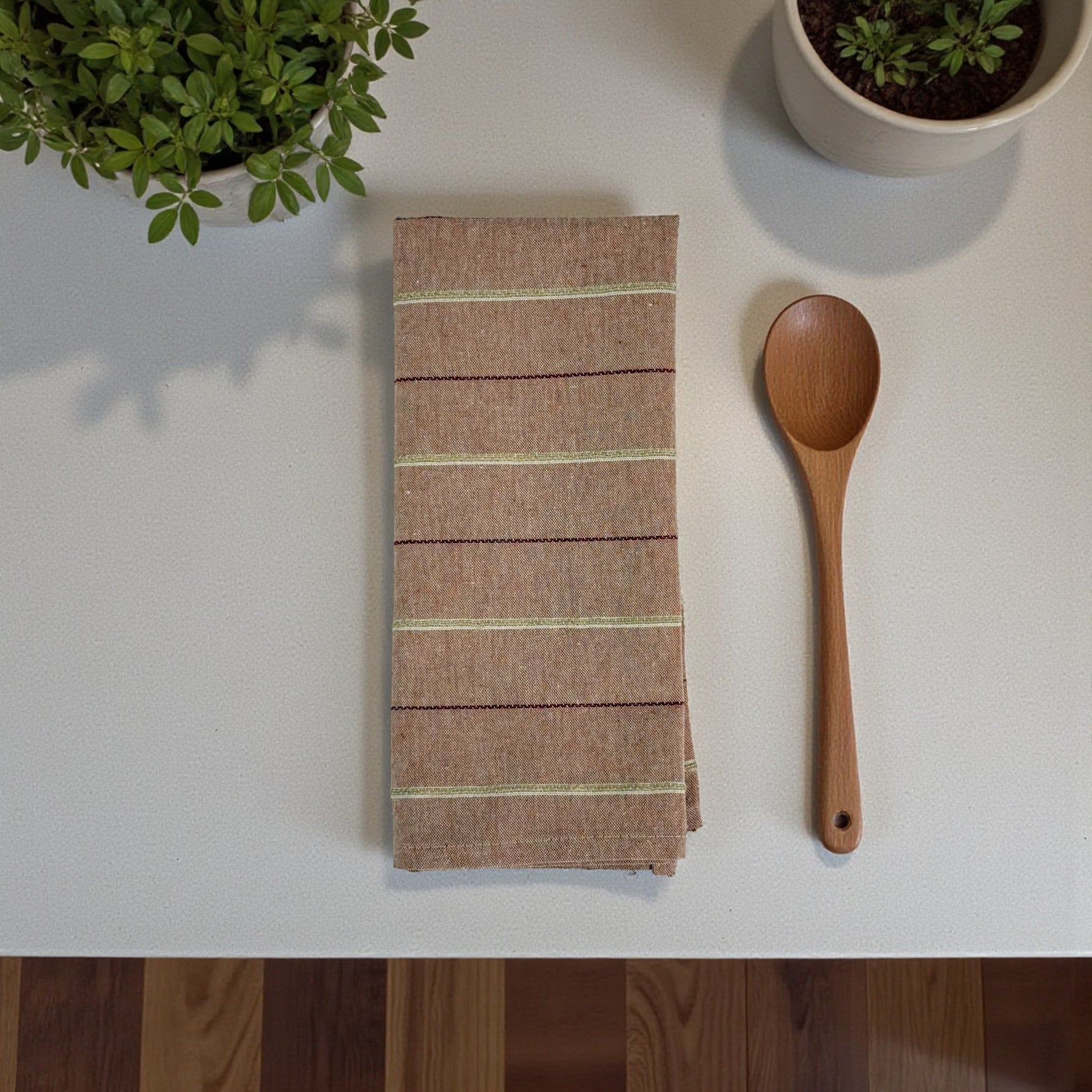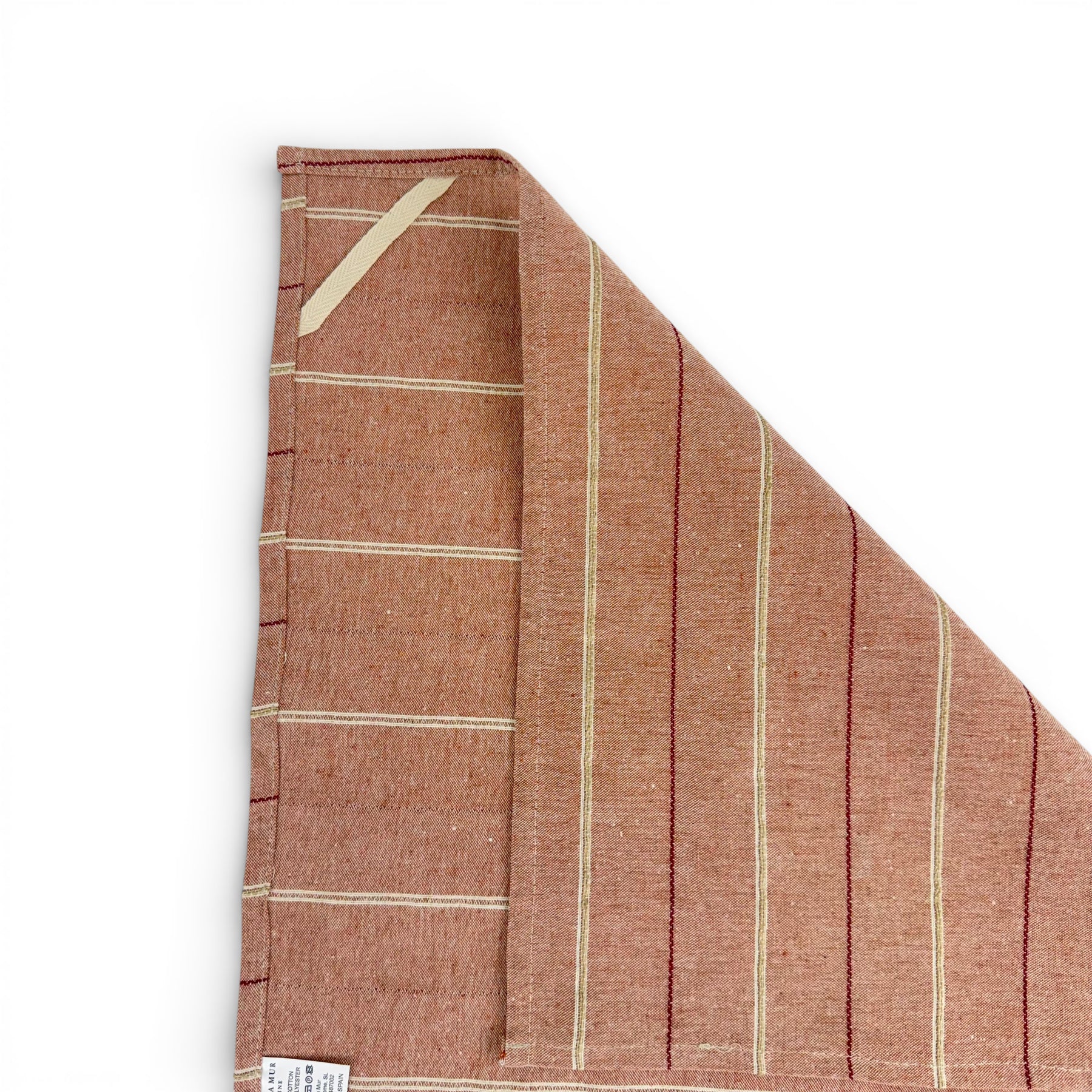 Paño de cocina con tira trasera para poder colgarlo, confeccionado en tejido fino con relieve 80% algodón y 20% poliéster, con estampado a rayas en tono rosado. Ligero, práctico y pensado para acompañarte en el día a día de la cocina con un toque bonito y delicado.