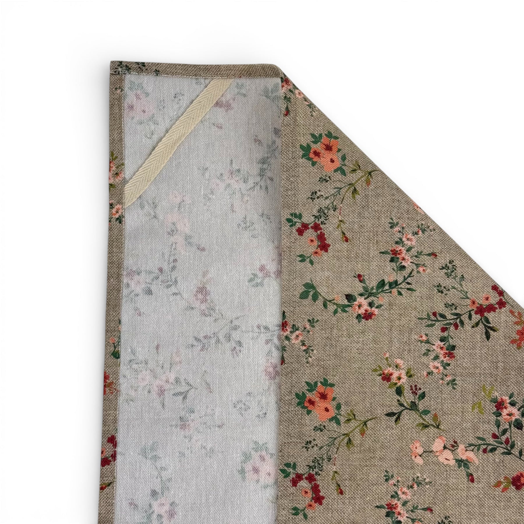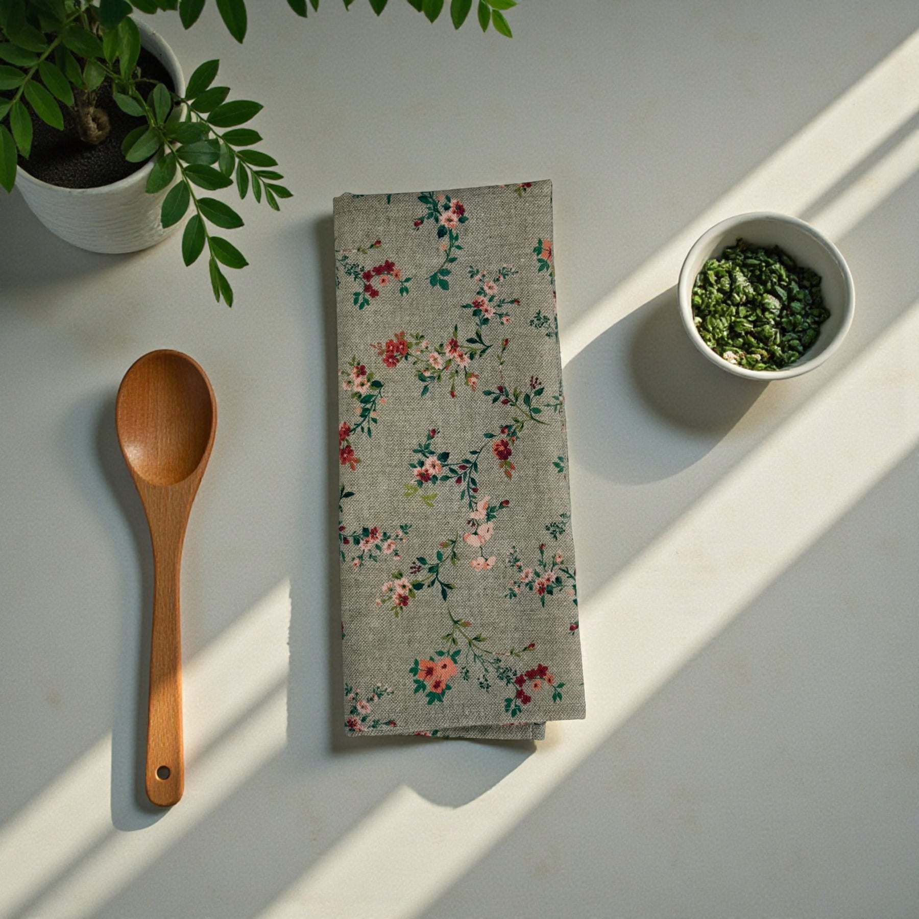 Paño de cocina con tira trasera para poder colgarlo, confeccionado en tejido fino de half-panama 80% algodón y 20% poliéster, con estampado floral naranja. Ligero, práctico y pensado para acompañarte en el día a día de la cocina con un toque bonito y delicado.