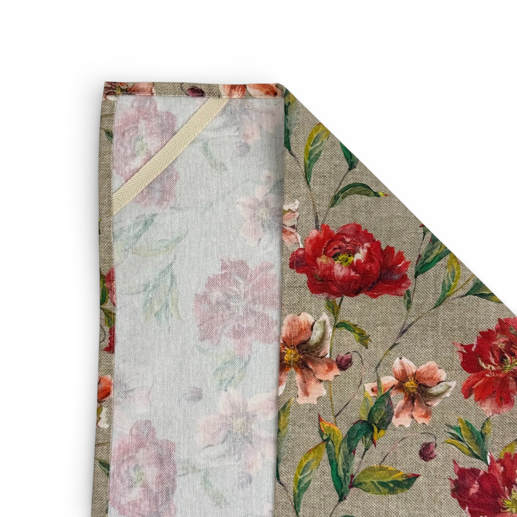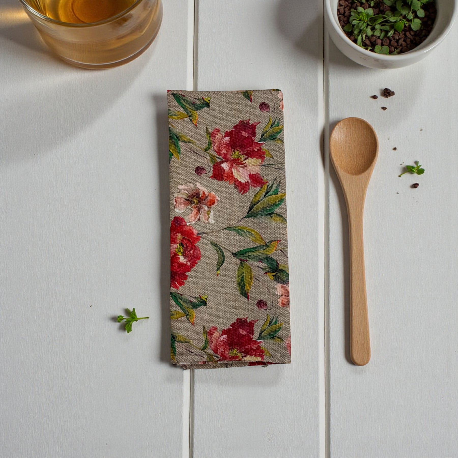 Paño de cocina con tira trasera para poder colgarlo, confeccionado en tejido fino de half-panama 80% algodón y 20% poliéster, con estampado floral rojo. Ligero, práctico y pensado para acompañarte en el día a día de la cocina con un toque bonito y delicado.