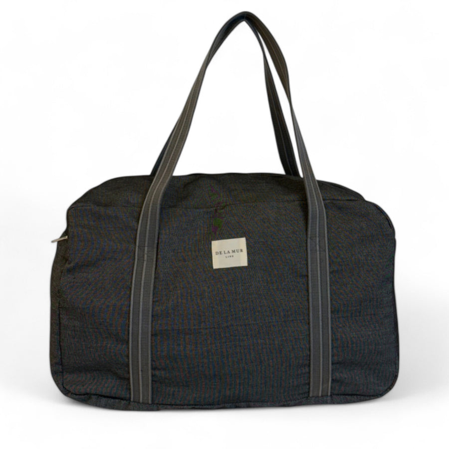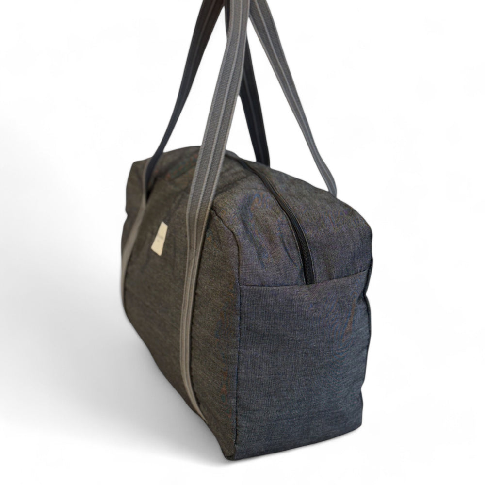 Bolsa de deporte con asas medianas en la parte superior de cinta de algodón de color gris. Con tejido grueso liso de color gris oscuro. Cierre superior con cremallera de color gris. Bolsillo interior con cremallera. Forrado de tejido grueso de color gris en la parte interior. Para su correcto mantenimiento se aconseja lavarlo en frío a mano y no utilizar secadora.