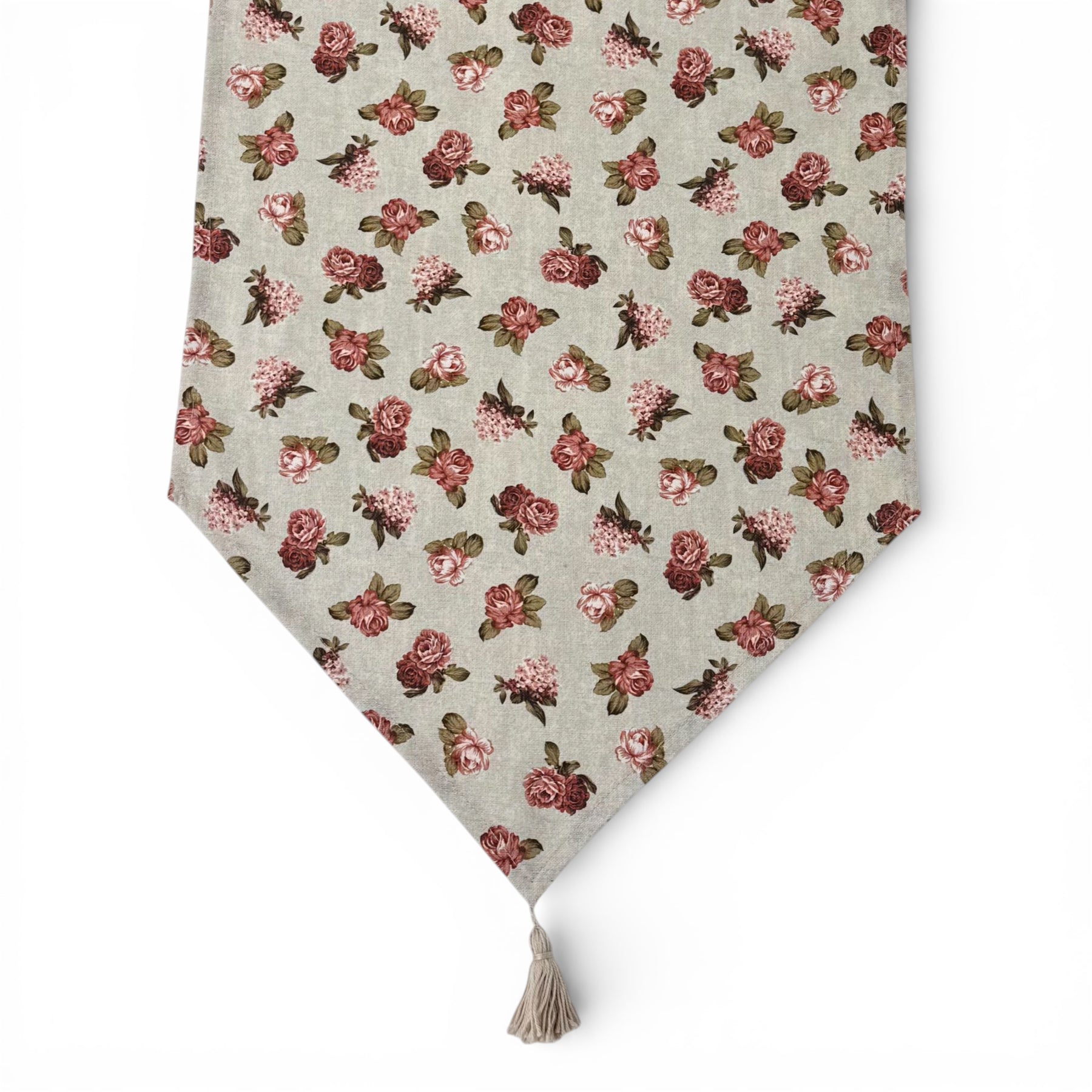 Camino de mesa acabado en forma de pico con borlas beige en los extremos, confeccionado en tejido fino de half-panama 80% algodón y 20% poliéster, con estampado floral en tonos rosados. Una pieza con textura y carácter que realza la mesa y aporta un toque decorativo muy especial.