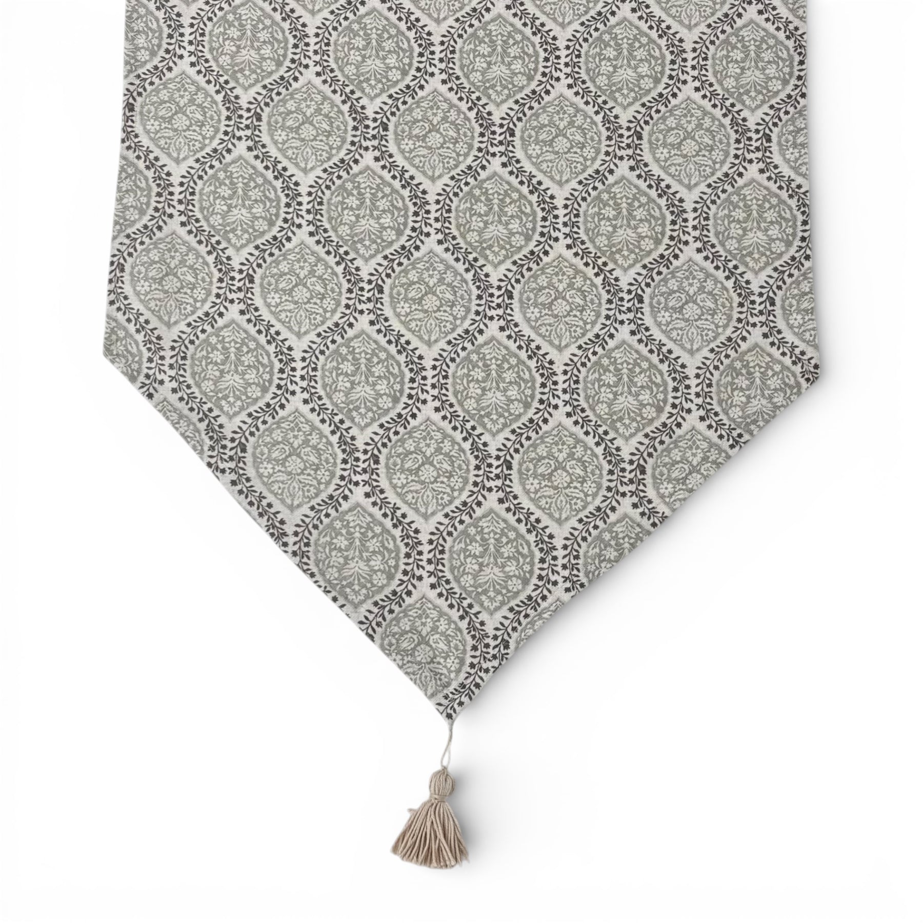 Camino de mesa acabado en forma de pico con borlas beige en los extremos, confeccionado en tejido fino de half-panama 80% algodón y 20% poliéster, con estampado geométrico gris. Una pieza con textura y carácter que realza la mesa y aporta un toque decorativo muy especial.