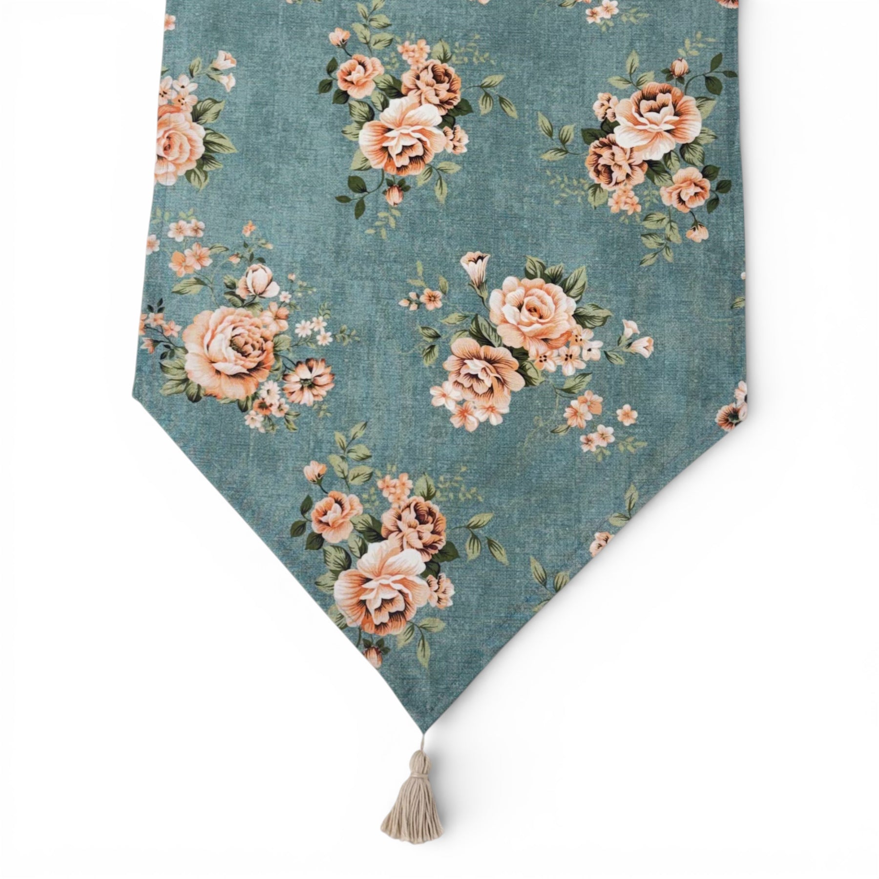 Camino de mesa acabado en forma de pico con borlas beige en los extremos, confeccionado en tejido fino de half-panama 80% algodón y 20% poliéster, con estampado floral en tonos rosados sobre fondo azul. Una pieza con textura y carácter que realza la mesa y aporta un toque decorativo muy especial.