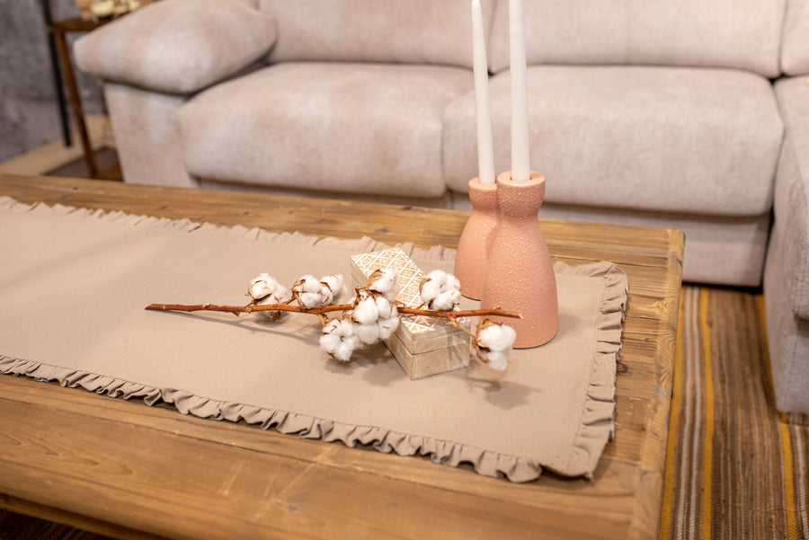 Camino de mesa rectangular con volantes en los extremos. Con tejido con 20% de lino y 80% de algodón en tono topo. Para su correcto mantenimiento se aconseja lavarlo en frío y no utilizar secadora.