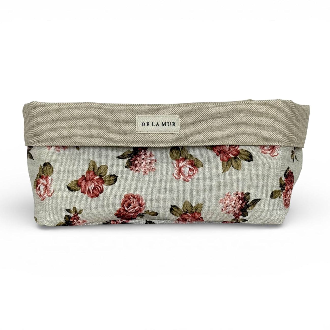 Cesta grande multiusos confeccionada en tejido fino de half-panama 80% algodón y 20% poliéster, con estampado floral rosado en el exterior. El interior está realizado en tejido resinado, pensado para aportar mayor resistencia y facilitar su uso diario.
