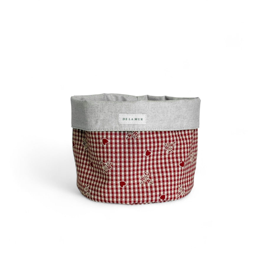Cesta mediana multiusos. Con tejido de jacquard con estampado a cuadritos con corazones y flores de color rojo y blanco en el exterior, y tejido resinado en el interior. Para su correcto mantenimiento se aconseja lavarlo en frío y no utilizar la secadora.
