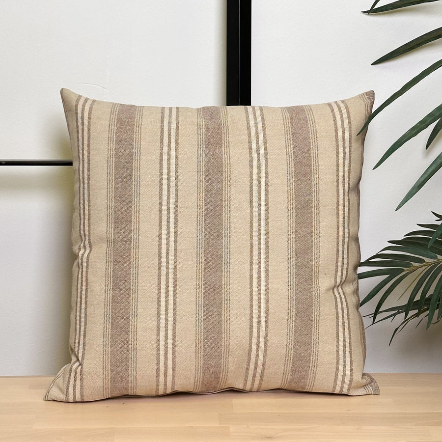 Funda de cojín sin relleno. Combinado con dos tejidos diferentes, un tejido con estampado a rayas en tonos beige y marrón por una cara, y un tejido liso de color beige por la otra. Para su correcto mantenimiento se aconseja lavarlo en frío y no utilizar secadora.