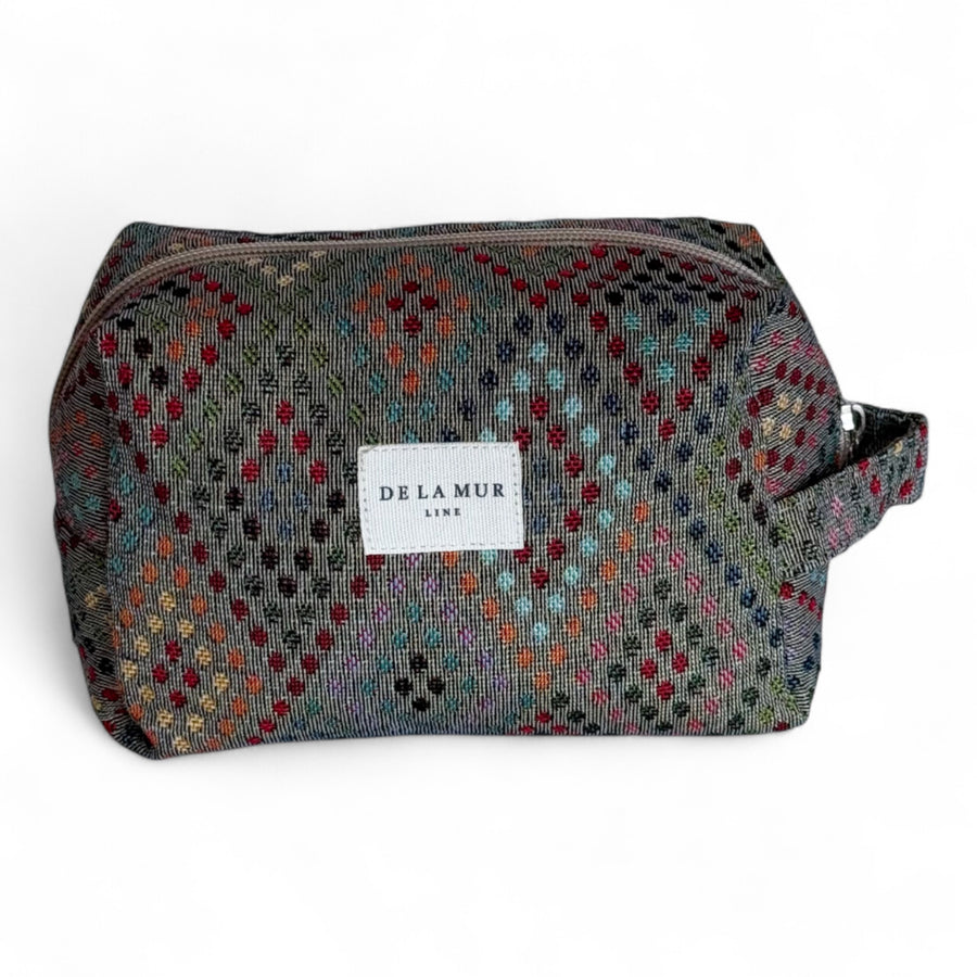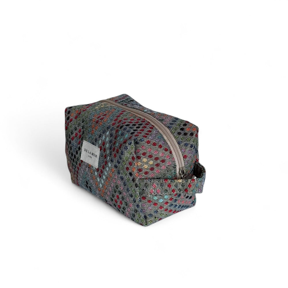 Neceser mediano con cremallera en la parte superior y con asa lateral. Con tejido grueso de jacquard con estampado geométrico multicolor. Para su correcto mantenimiento se aconseja lavarlo en frío y no utilizar secadora.