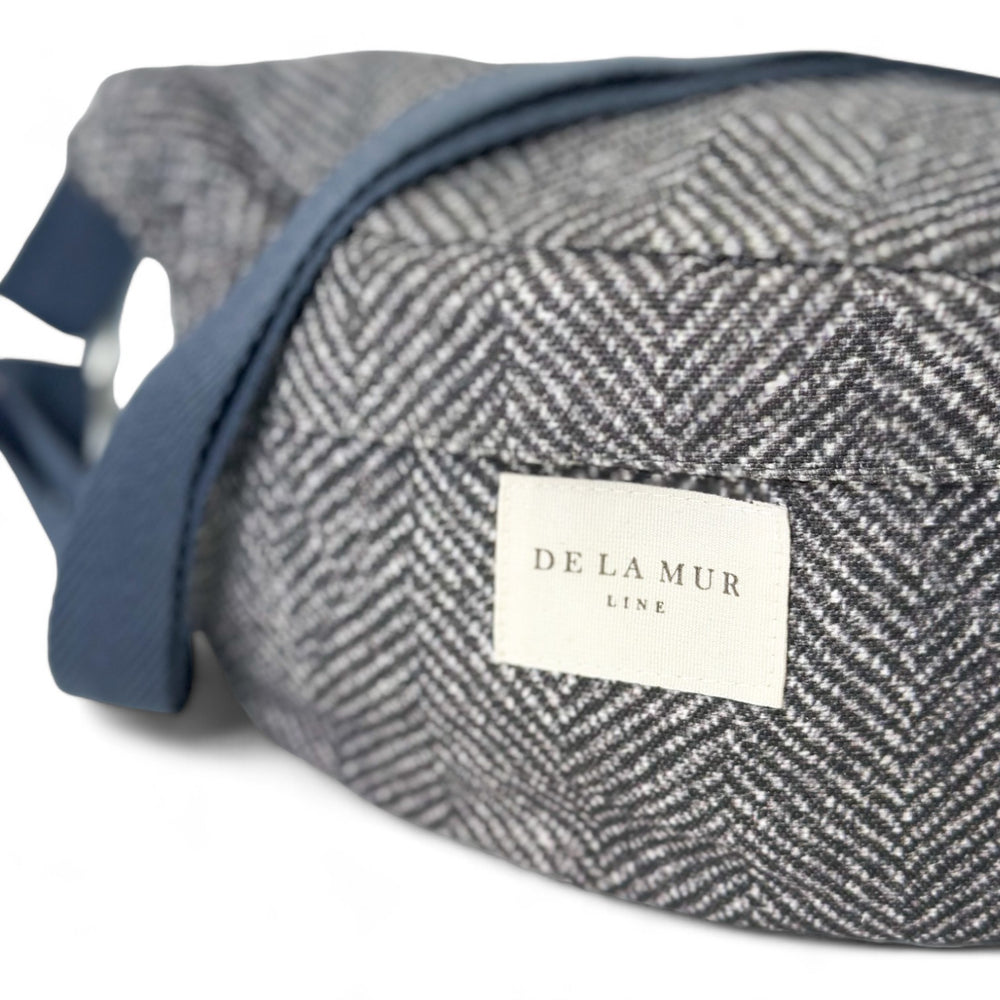Bolso riñonera tipo bandolera con asa larga ajustable de cinta de espiga de algodón de color gris oscuro. Con un tejido fino con estampado de espiga de color gris oscuro. Cierre superior con cremallera. Forrado de tejido grueso de color gris en la parte interior. Para su correcto mantenimiento se aconseja lavarlo en frío a mano y no utilizar secadora.