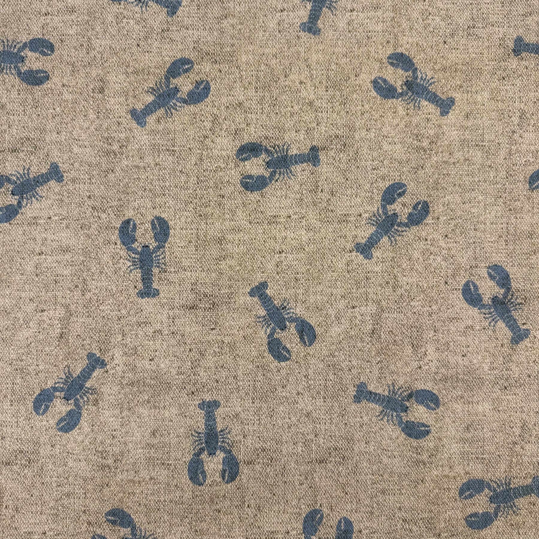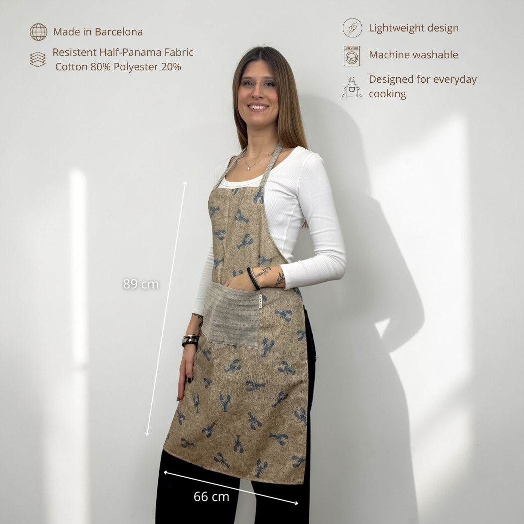 Delantal con bolsillo delantero, confeccionado en tejido fino de half-panama 80% algodón y 20% poliéster con estampado de langostinos azules. El bolsillo en un tejido a rayas azules sobre fondo beige, que aporta contraste y un toque especial que lo hace aún más único.