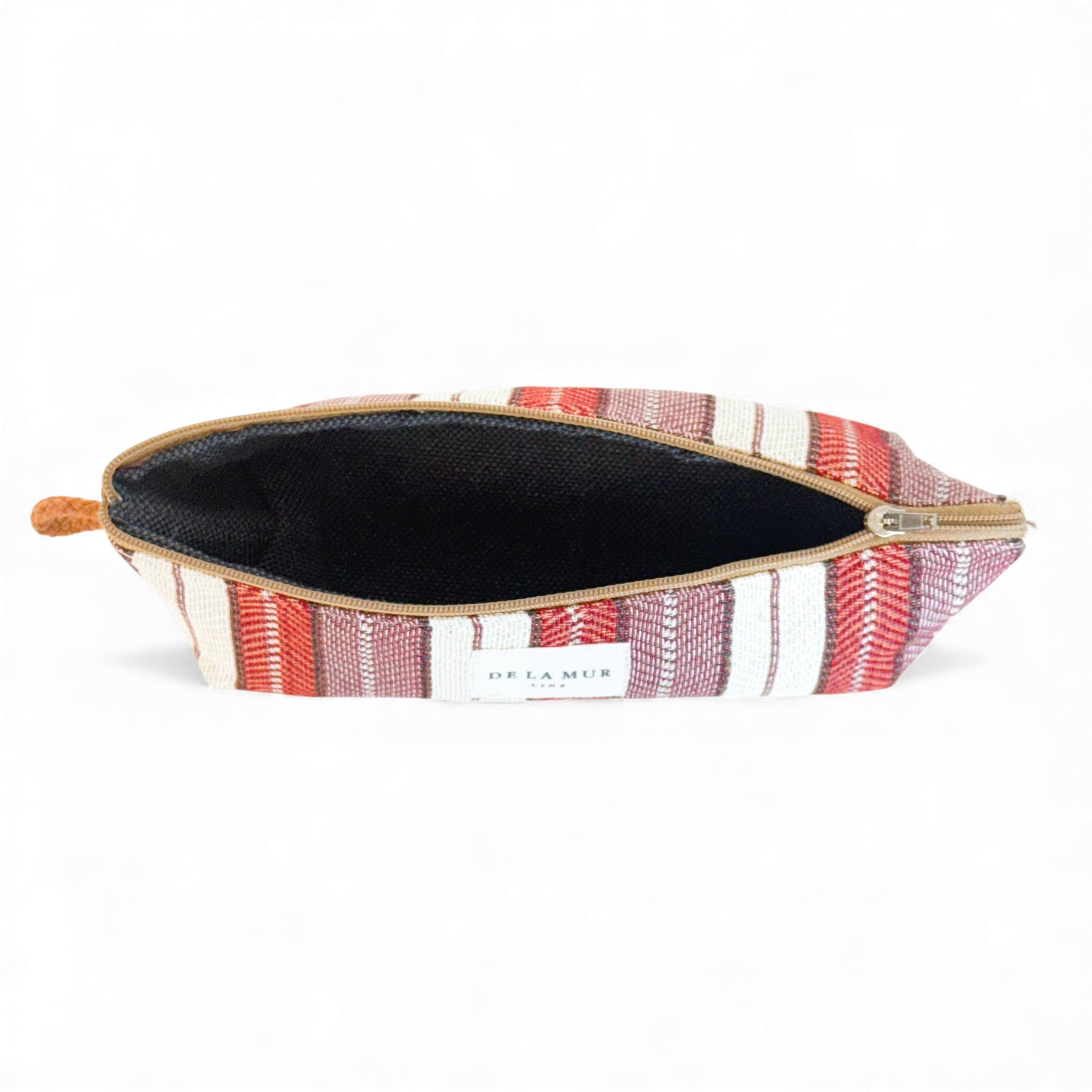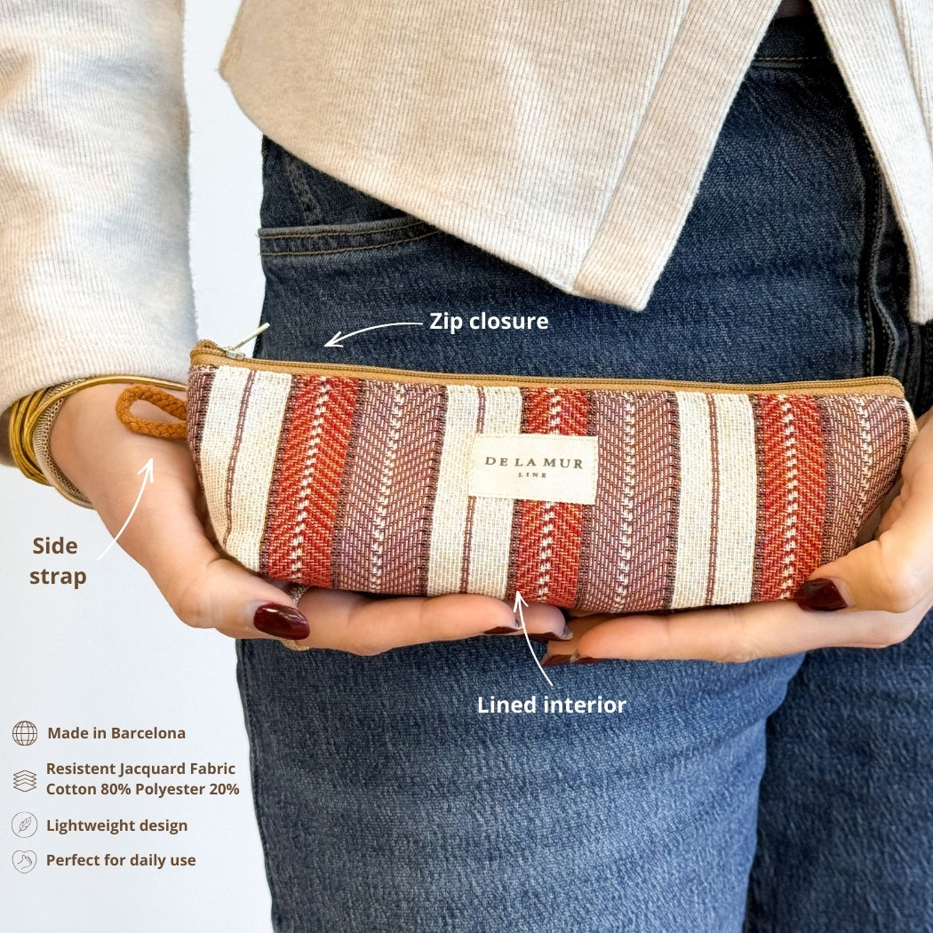 Estuche con cremallera en la parte superior. Con tejido grueso de jacquard 80% algodón y 20% poliéster con estampado a rayas en tonos granate, lila y crudo. Cada articulo puede tener una variación en el estampado, dependiendo de donde se haya efectuado el corte de la pieza. Forrado de tejido grueso de color gris en la parte interior. Para su correcto mantenimiento se aconseja lavarlo en frío y no utilizar secadora.