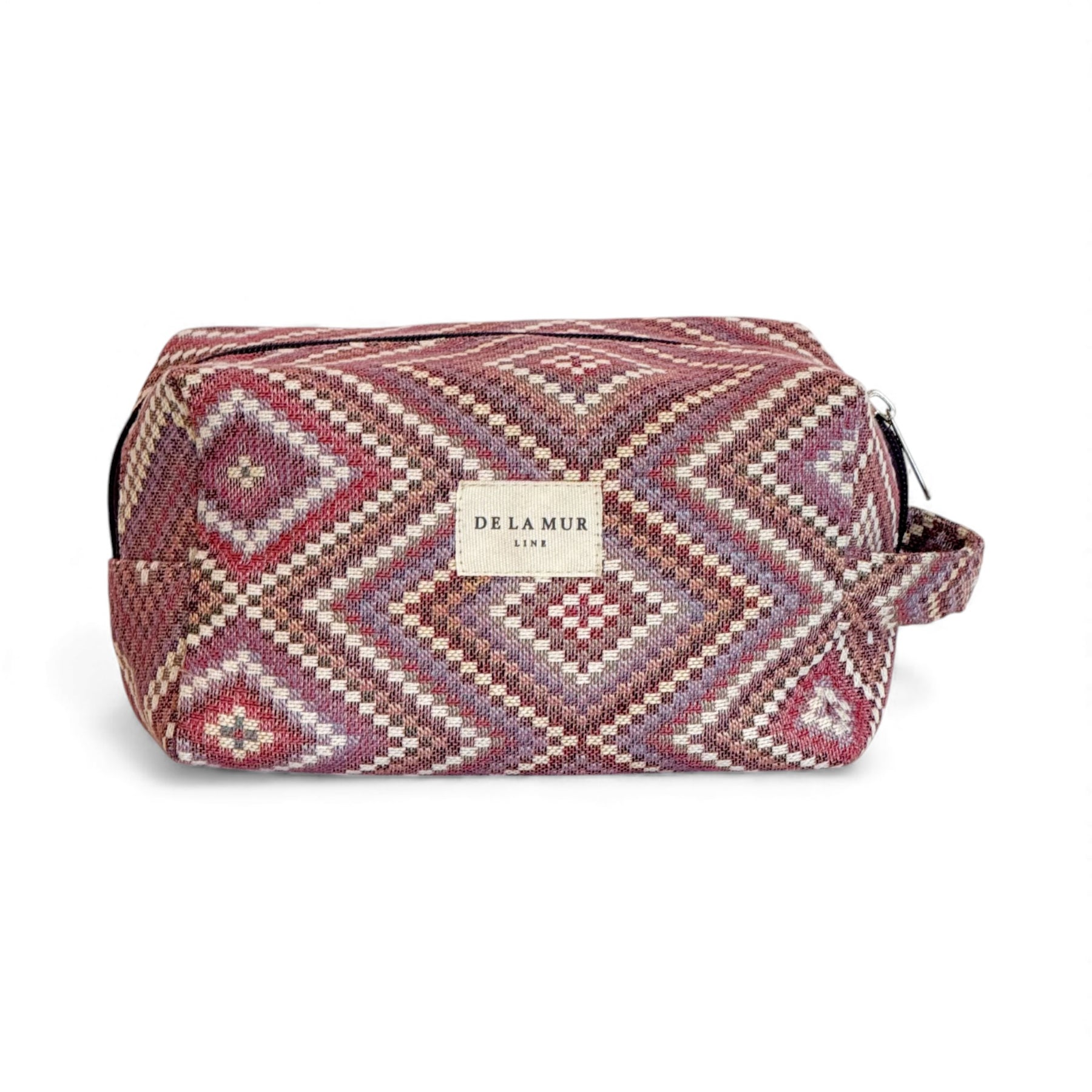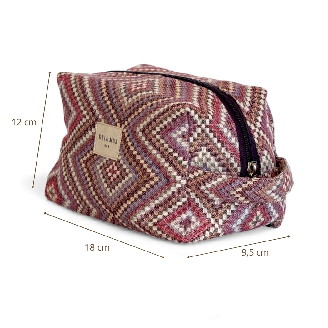 Neceser mediano con cremallera en la parte superior y con asa lateral. Con tejido grueso de jacquard 80% algodón y 20% poliéster con estampado geométrico en tonos rosas y lilas. Para su correcto mantenimiento se aconseja lavarlo en frío y no utilizar secadora.