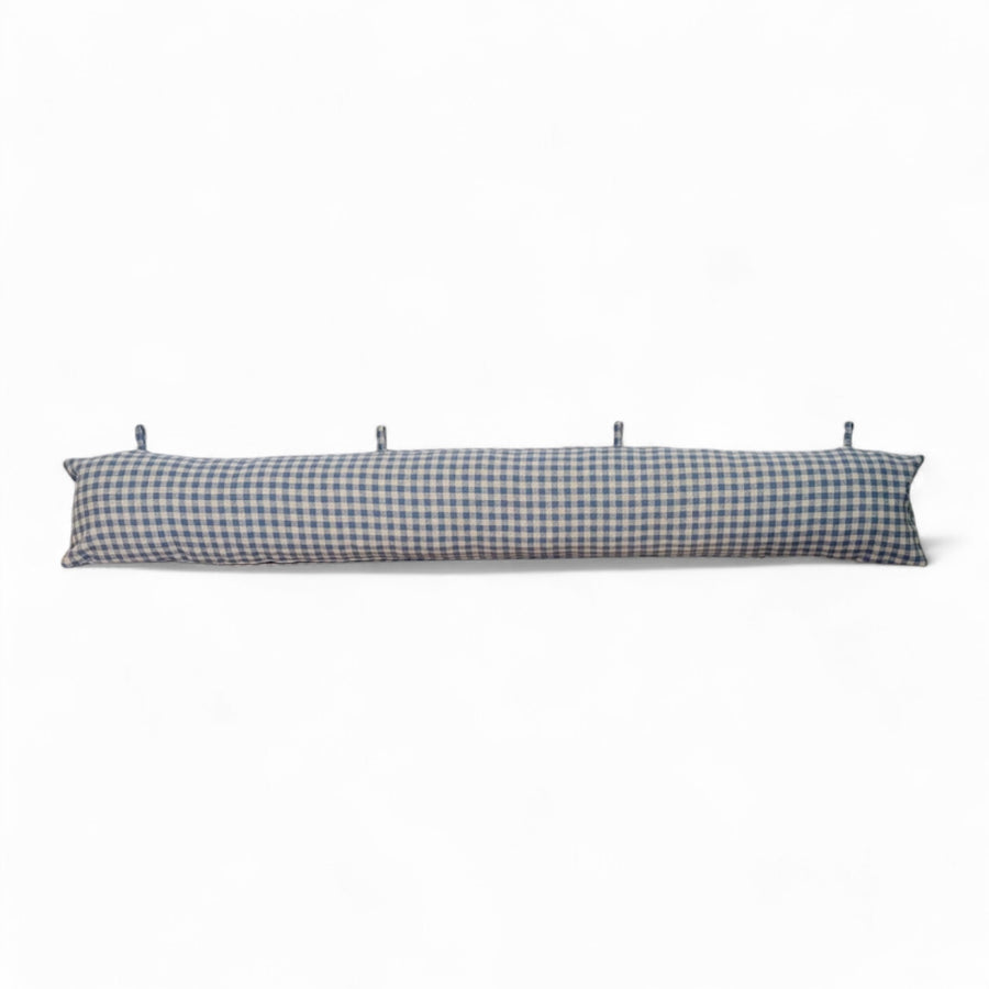 Coupe-vent avec rembourrage. Avec petites poignées à accrocher à la porte. En tissu semi-panama fin avec imprimé à carreaux bleus. Pour un bon entretien, il est recommandé de le laver à l'eau froide et de ne pas utiliser de sèche-linge.