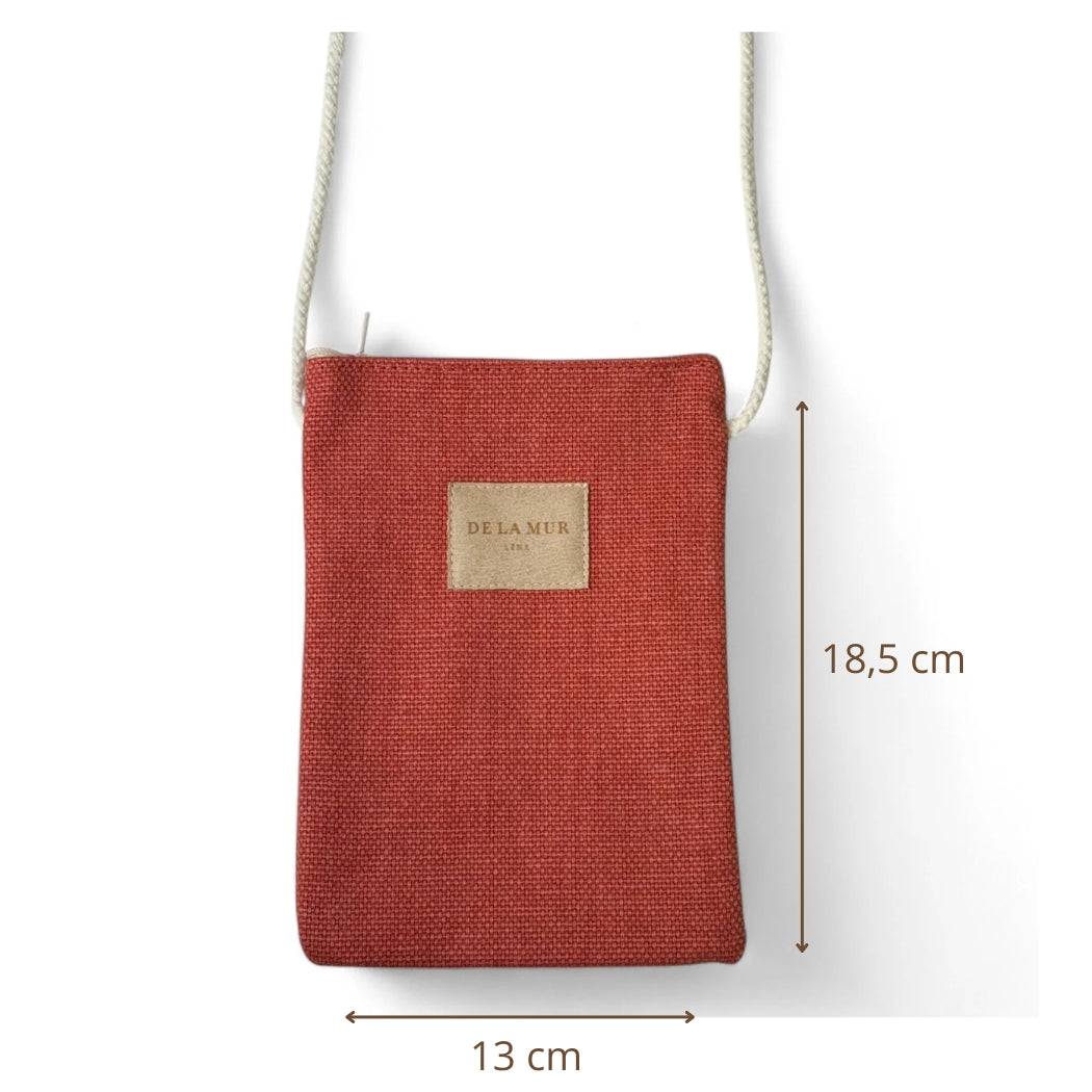Bolsito porta móvil para llevar tipo bandolera. Con cremallera en la parte superior y cordón largo de algodón de color crudp. Con tejido grueso de color teja. Forrado de tejido grueso de color gris en la parte interior. Etiqueta de marca de polipiel. Para su correcto mantenimiento se aconseja lavarlo en frío a mano y no utilizar secadora.