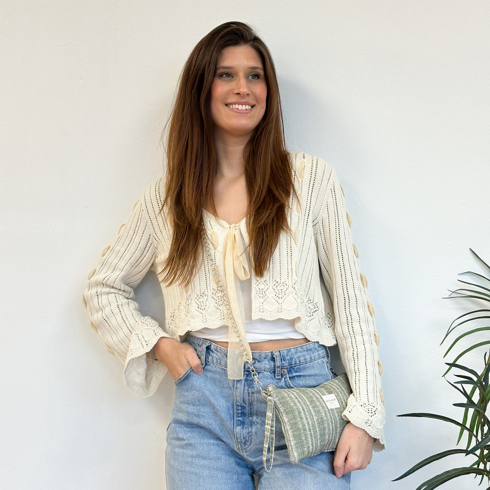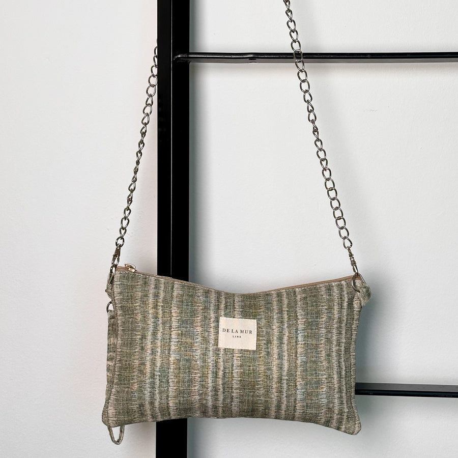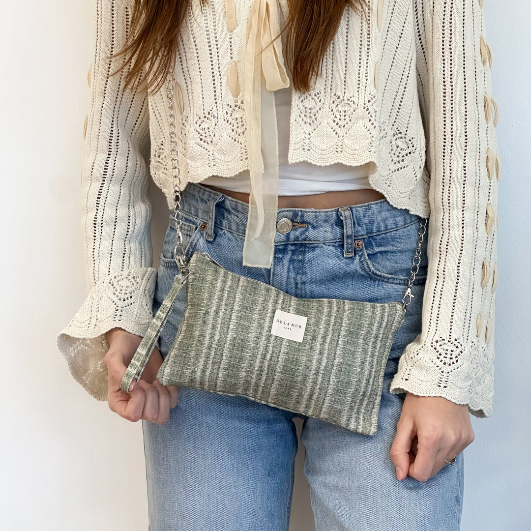 Bolso tipo “Clutch” con asa de cadena de color plata y con asa pequeña en el lateral extraíble para llevar en la muñeca. Con tejido estampado tie dye en tonos verdes. Para su correcto mantenimiento se aconseja lavarlo en frío y no utilizar secadora.