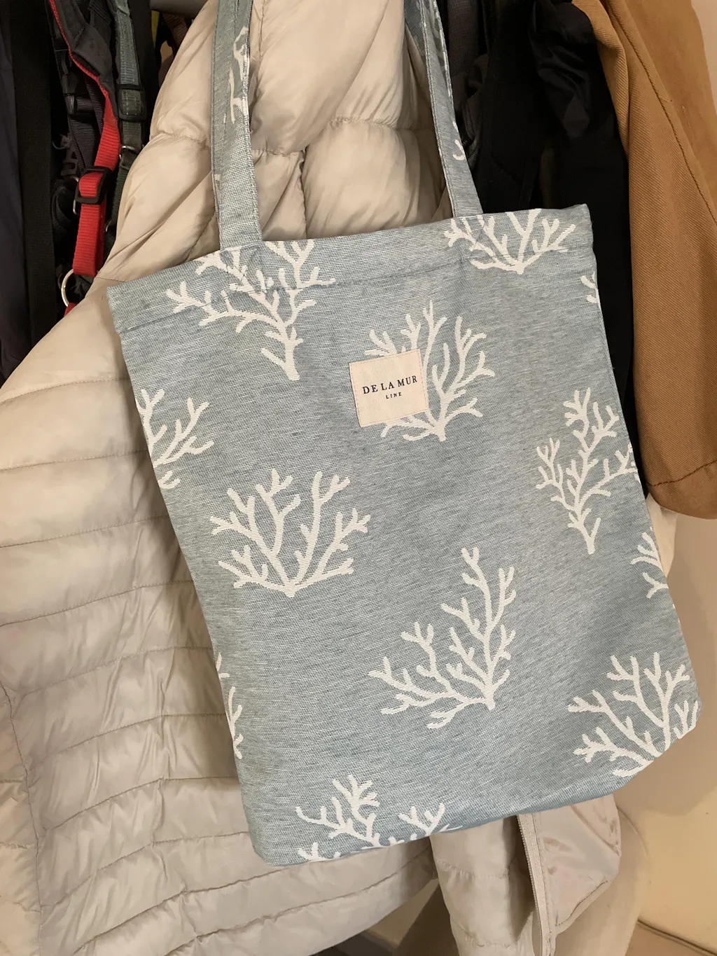 Bolsa "tote bag" con asas para llevar al hombro. Con tejido grueso de jacquard 80% algodón y 20% poliéster con estampado de coral en tono crudo sobre fondo azul clarito. Con cremallera en la parte superior. Para su correcto mantenimiento se aconseja lavarlo en frío y no utilizar secadora.