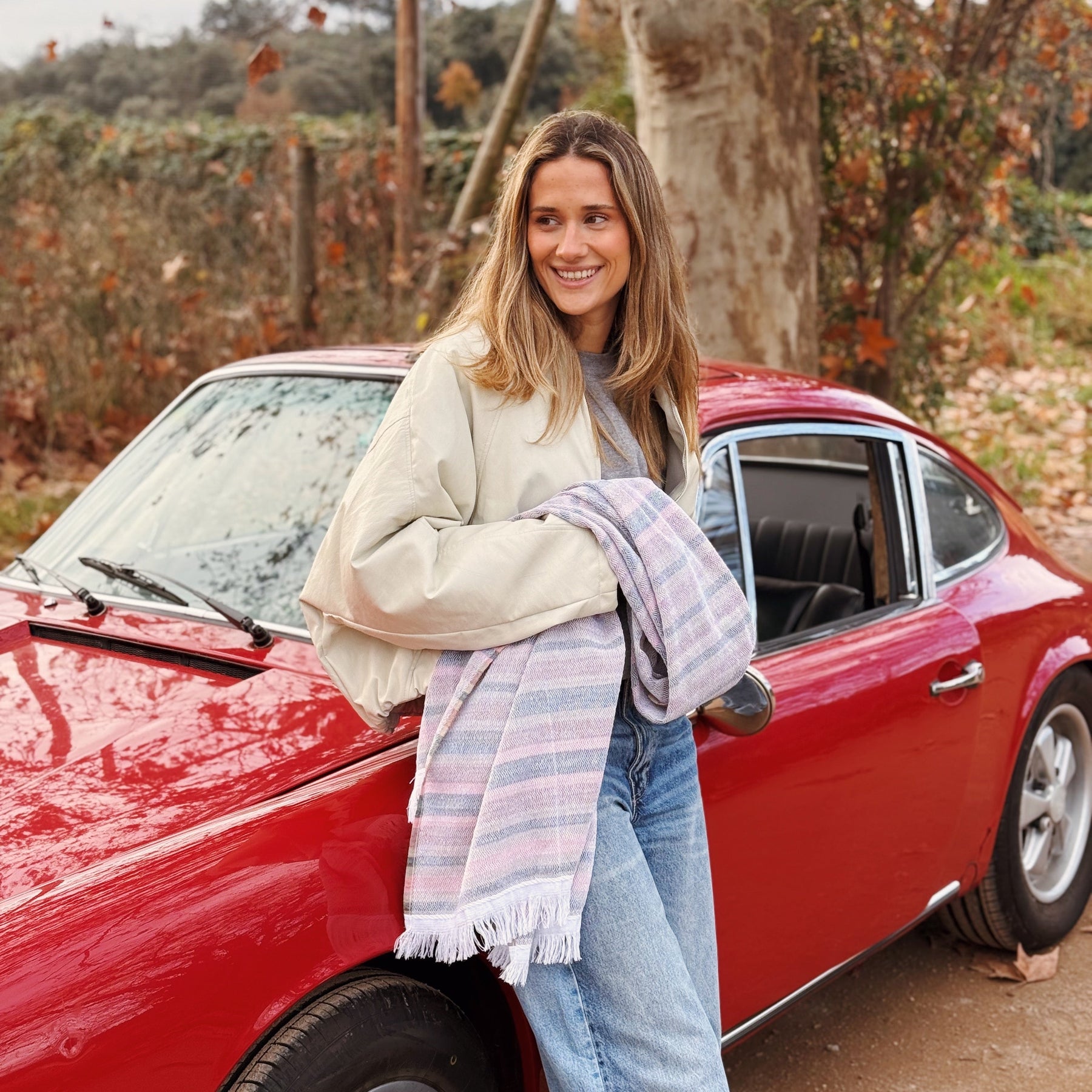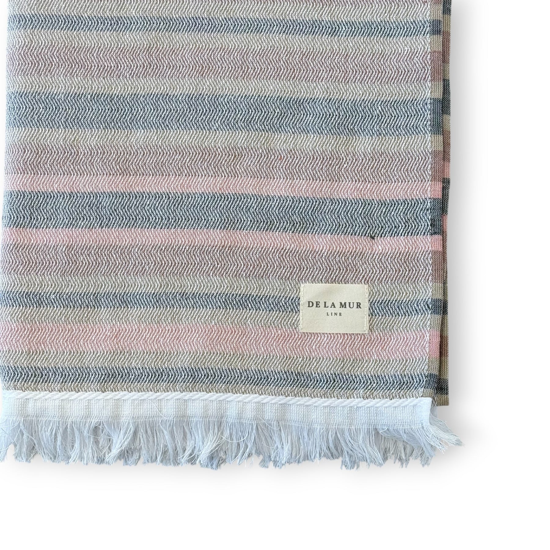 Toalla multiusos de tejido ligero 50% algodón reciclado y 50% poliéster con flecos en los laterales. Con estampado a rayas multicolor. Medida única. Para su correcto mantenimiento se aconseja lavarlo en frío y no utilizar secadora.