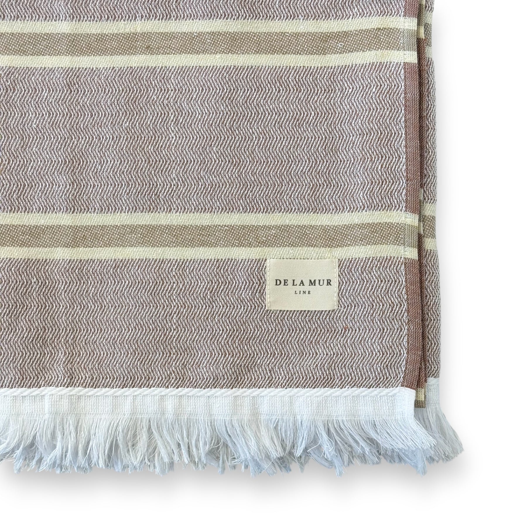 Toalla multiusos de tejido ligero 50% algodón reciclado y 50% poliéster con flecos en los laterales. Con estampado a rayas multicolor. Medida única. Para su correcto mantenimiento se aconseja lavarlo en frío y no utilizar secadora.