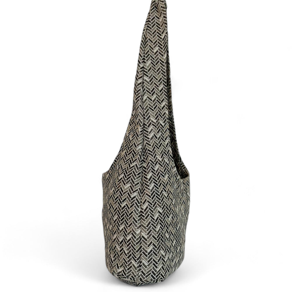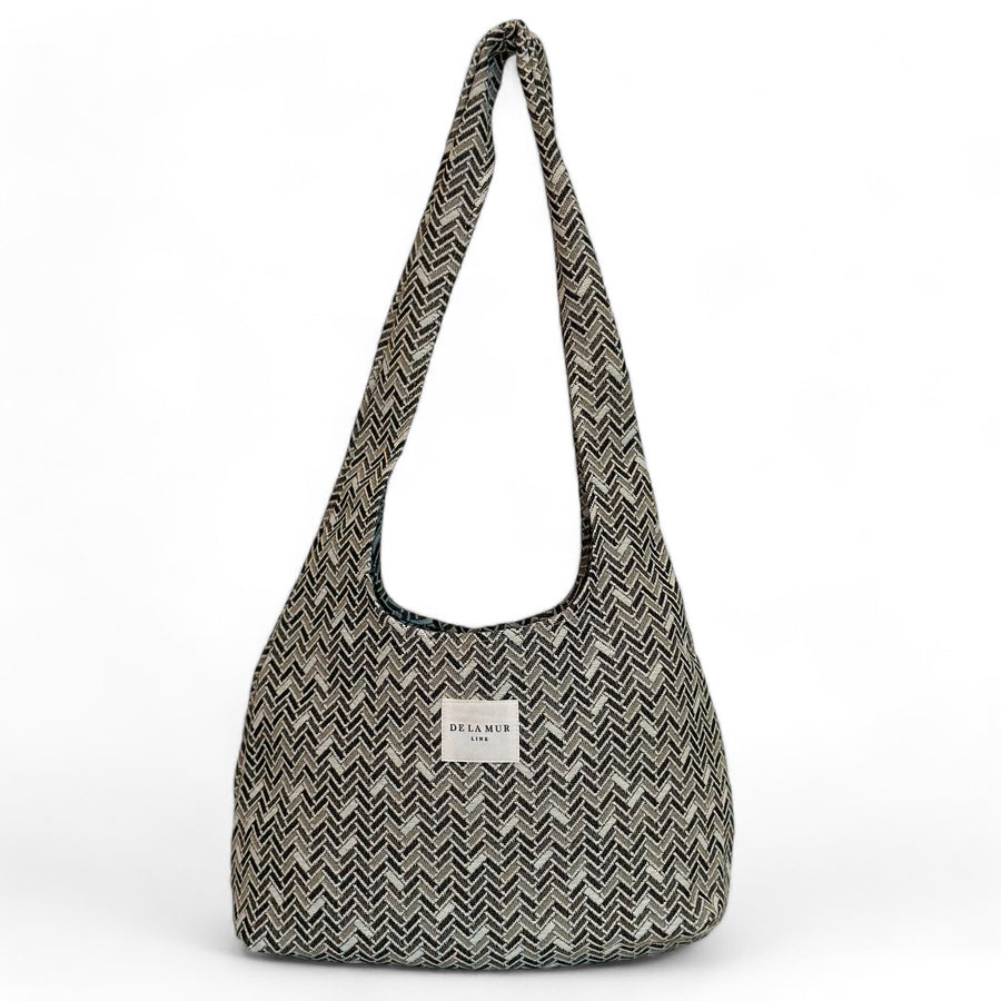 Bolsa ovalada con asas para llevar al hombro. Con un tejido grueso de jacquard con estampado geométrico en tonos marrón. Para su correcto mantenimiento se aconseja lavarlo en frío a mano y no utilizar secadora.