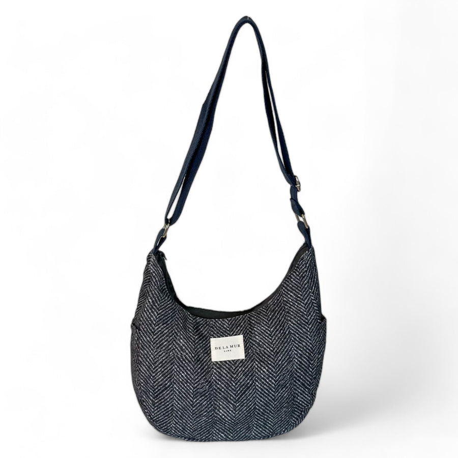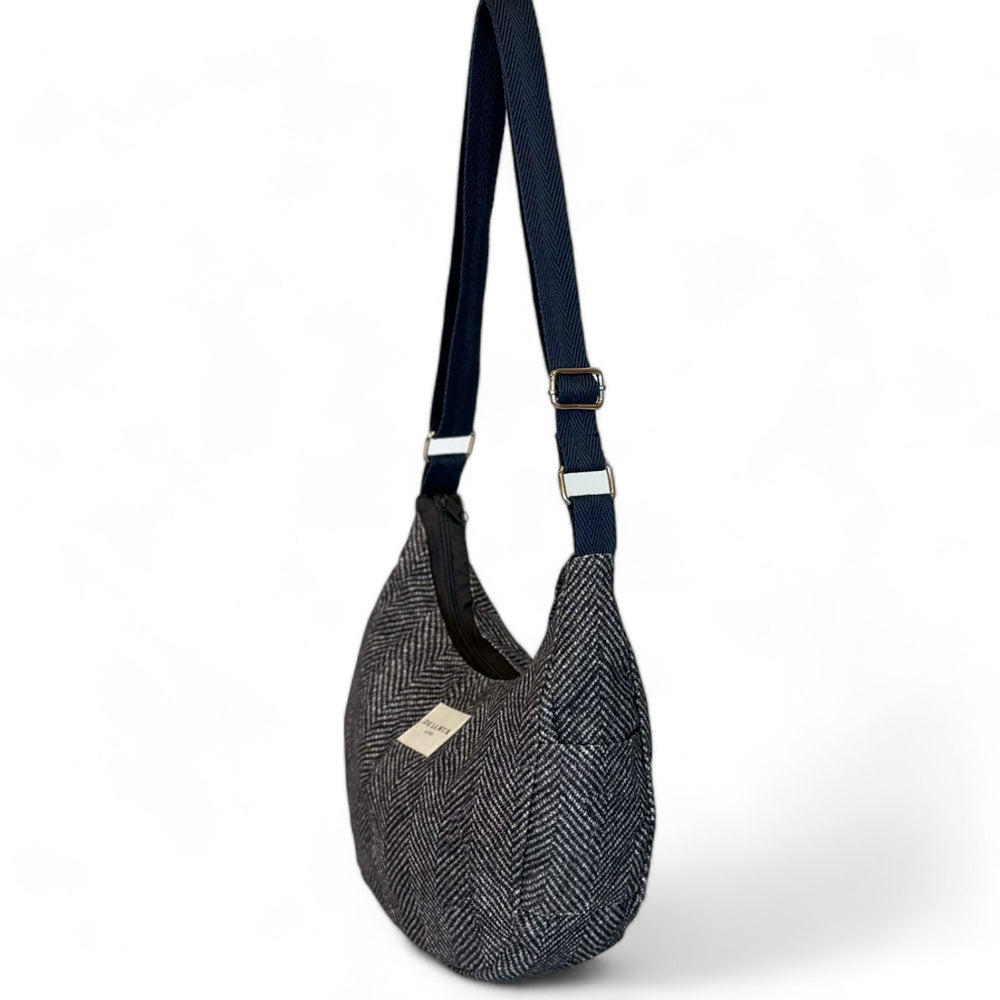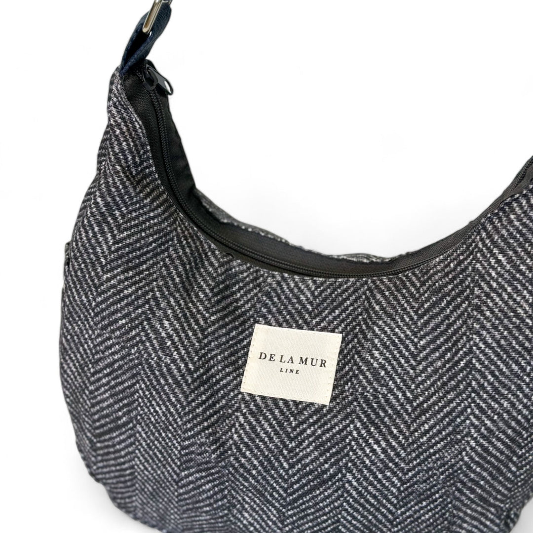 Bolso luna tipo bandolera con asa larga ajustable de cinta de espiga de algodón de color gris oscuro. Cierre superior con cremallera. Bolsillos laterales sin cremallera. Con tejido fino con estampado de espiga de color gris oscuro. Forrado de tejido grueso de color gris en la parte interior. Bolsillo interior con cremallera. Para su correcto mantenimiento se aconseja lavarlo en frío a mano y no utilizar secadora.