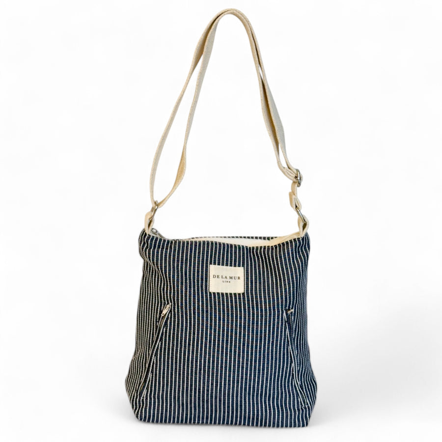Bolso mediano tipo bandolera con asa larga ajustable de cinta de espiga de algodón de color crudo. Con un tejido fino a rayas de color crudo sobre fondo azul marino. Cierre superior con cremallera. Dos bolsillos en la parte frontal con cremallera. Forrado de tejido grueso de color gris en la parte interior. Bolsillo interior con cremallera. Para su correcto mantenimiento se aconseja lavarlo en frío a mano y no utilizar secadora.