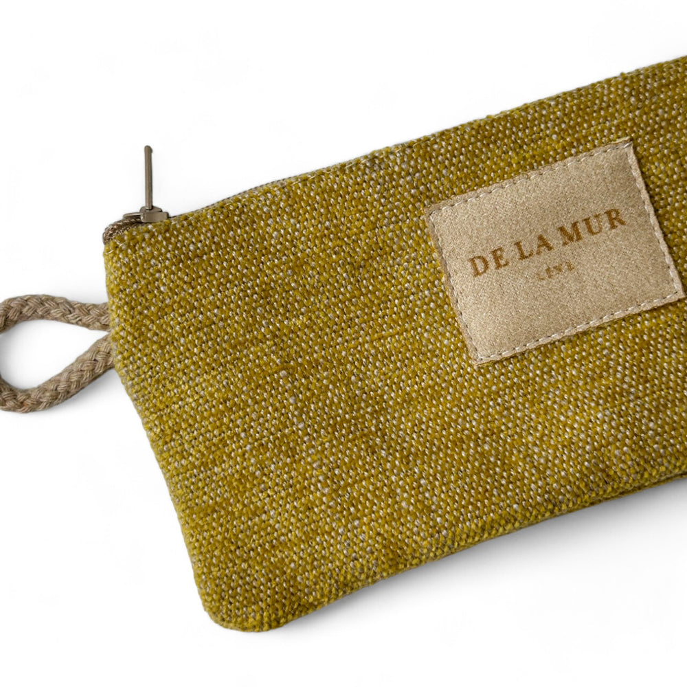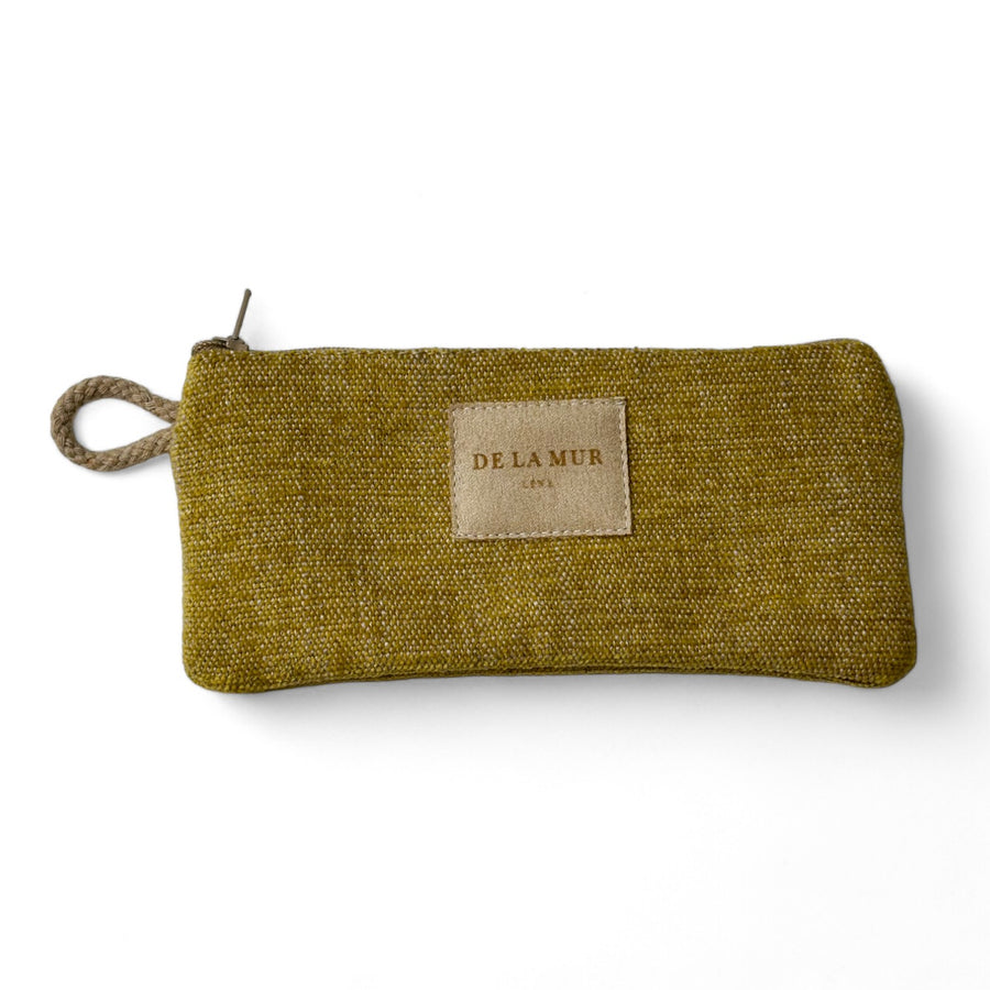 Funda de gafas con cremallera en la parte superior y pequeña asa de cordón de color beige en el lateral. Con un tejido liso efecto desgastado de color ocre. Forrado de tejido grueso de color gris en la parte interior. Para su correcto mantenimiento se aconseja lavarlo en frío a mano y no utilizar secadora.