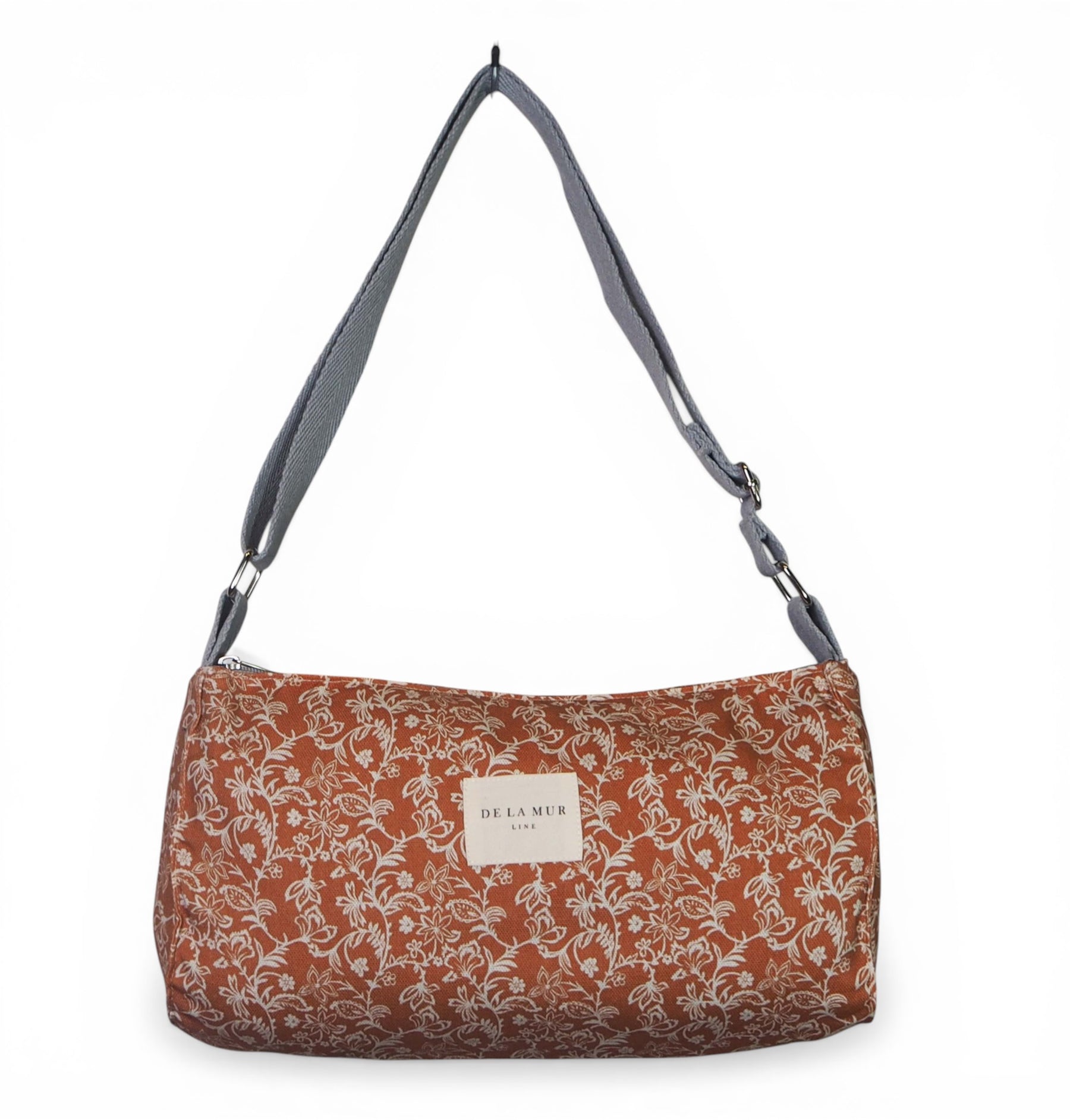 Bolso pequeño tipo bandolera con asa larga ajustable. Con tejido con estampado floral con fondo anaranjado. Bolsillo interior con cremallera. Asa de cinta de espiga de algodón de color gris. Para su correcto mantenimiento se aconseja lavarlo en frío y no utilizar secadora.