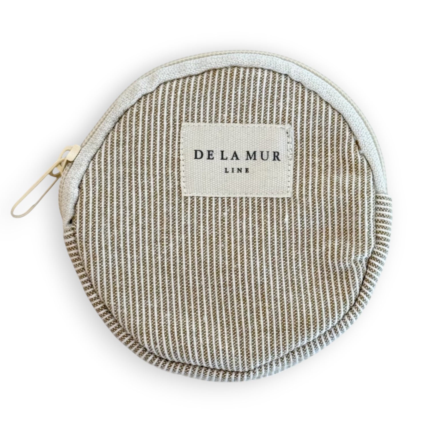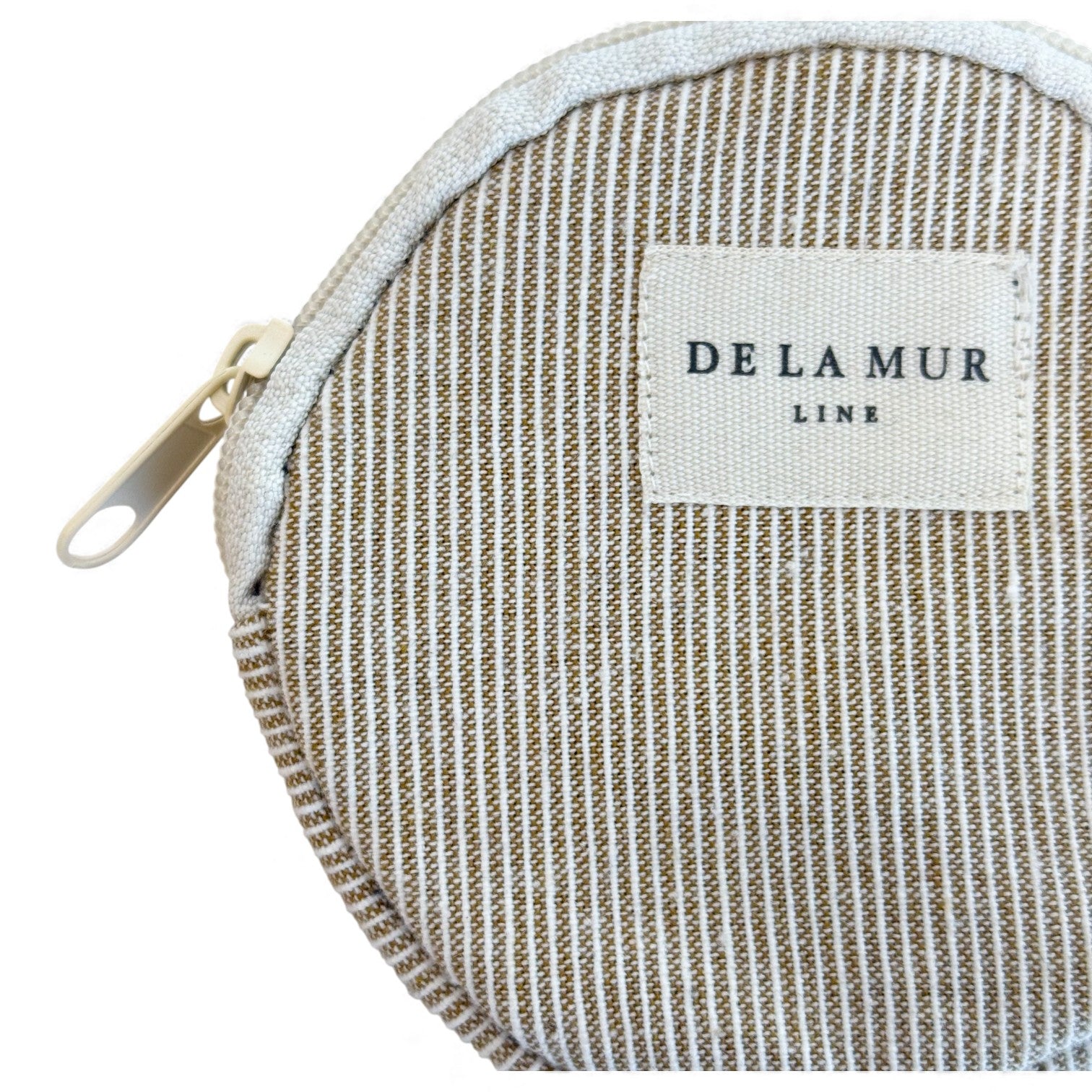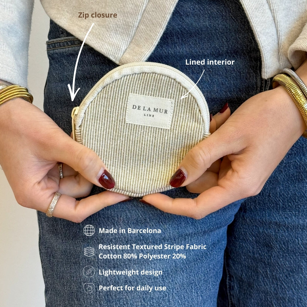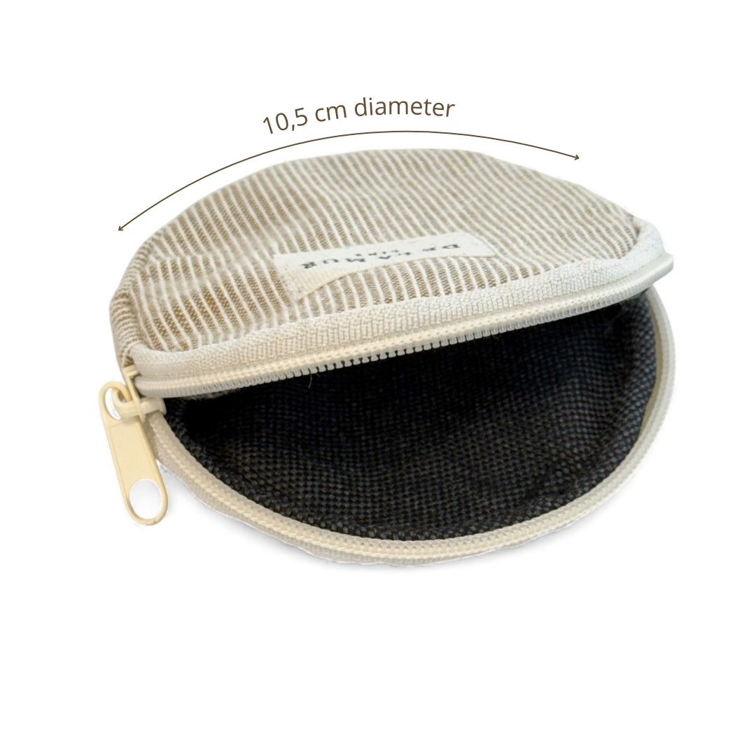 Monedero redondo con cremallera en la parte superior. Con tejido fino con relieve 80% algodón y 20% poliéster con estampado a rayas en tono mostaza clarito. Cada articulo puede tener una variación en el estampado, dependiendo de donde se haya efectuado el corte de la pieza. Forrado de tejido grueso de color gris en la parte interior. Para su correcto mantenimiento se aconseja lavarlo en frío y no utilizar secadora.