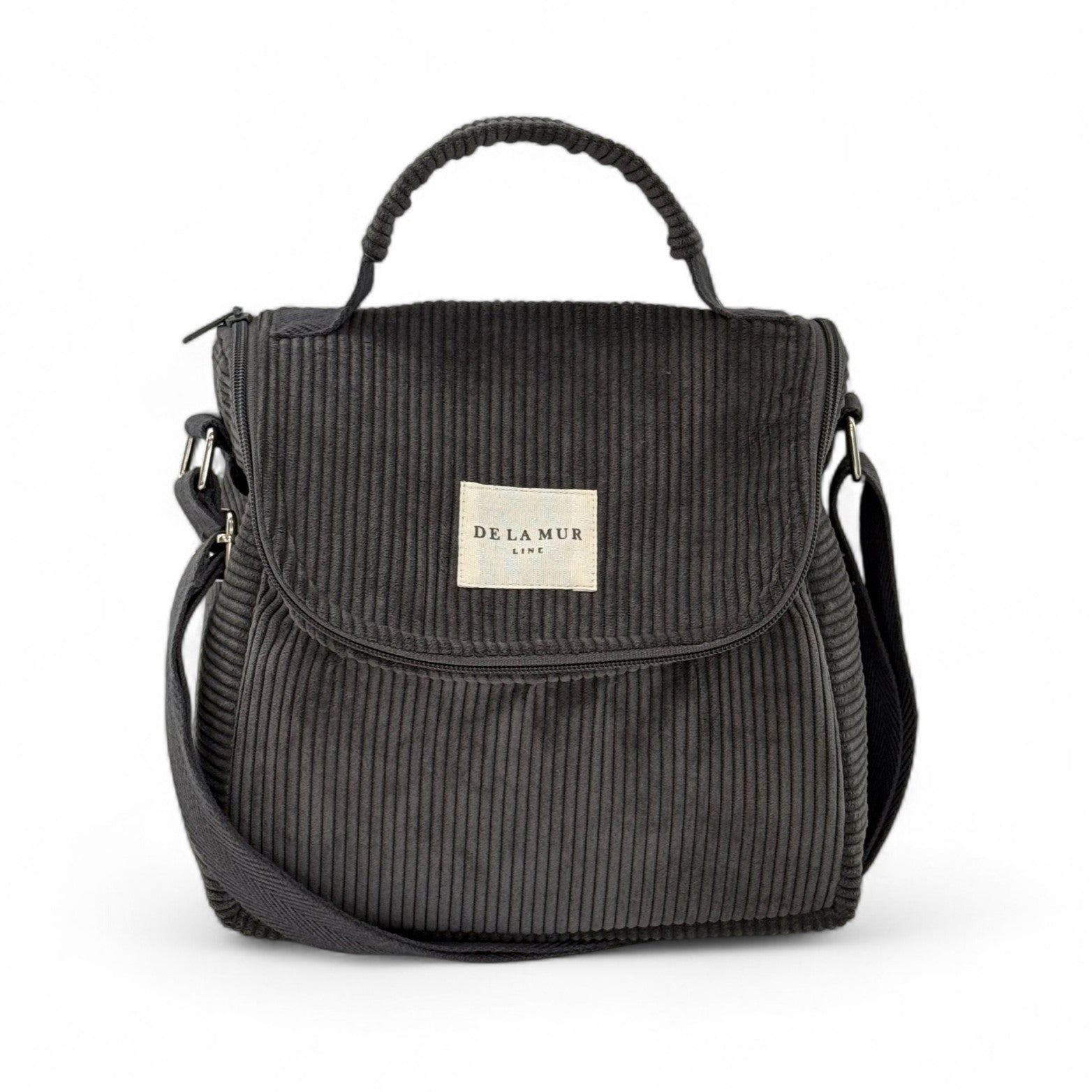 Bolso porta alimentos. Con un tejido grueso de pana de color gris oscuro en el exterior y capa de material térmico aislante para mantener temperatura en el interior. Con asa para llevar en la mano y asa de cinta de algodón de color gris oscuro regulable para llevar cruzado. Para su correcto mantenimiento se aconseja lavarlo en frío a mano y no utilizar secadora.
