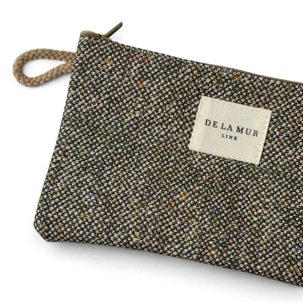Mini neceser con cremallera en la parte superior y pequeña asa de cordón de color beige en el lateral. Con tejido fino con estampado tipo saco de color caqui oscuro. Cada articulo puede tener una variación en el estampado, dependiendo de donde se haya efectuado el corte de la pieza. Forrado de tejido grueso de color gris en la parte interior. Para su correcto mantenimiento se aconseja lavarlo en frío a mano y no utilizar secadora.
