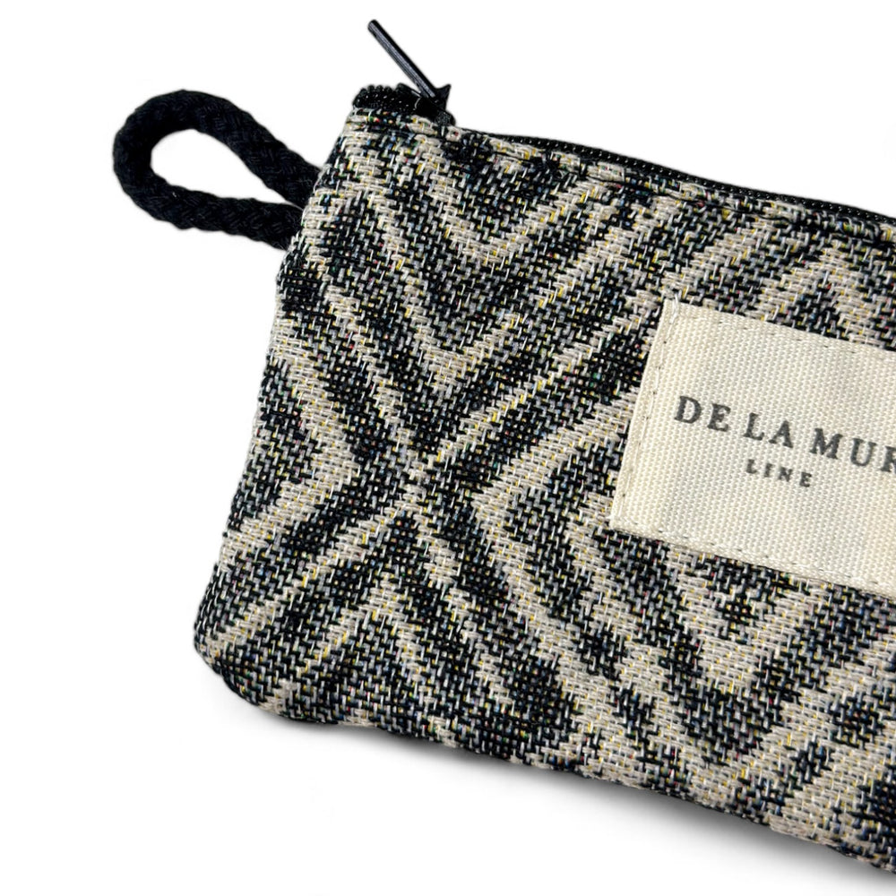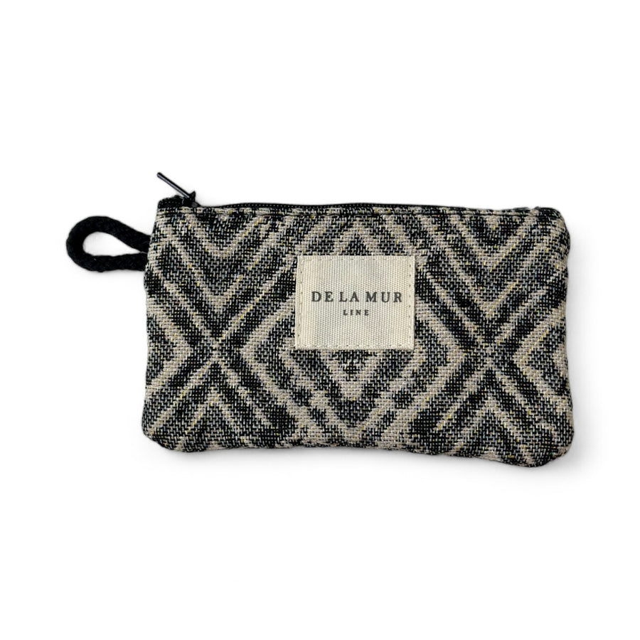 Monedero con cremallera en la parte superior y pequeña asa de cordón de color negro en el lateral. Con tejido grueso de jacquard con estampado geométrico en tonos gris oscuro. Cada articulo puede tener una variación en el estampado, dependiendo de donde se haya efectuado el corte de la pieza. Forrado de tejido grueso de color gris en la parte interior. Para su correcto mantenimiento se aconseja lavarlo en frío a mano y no utilizar secadora.
