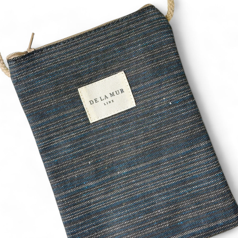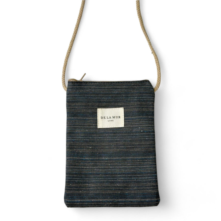 Bolsito porta móvil para llevar tipo bandolera, con cremallera en la parte superior y cordón largo de algodón de color beige. Con tejido grueso a rayas en tono azul oscuro y marrón. Cada articulo puede tener una variación en el estampado, dependiendo de donde se haya efectuado el corte de la pieza. Forrado de tejido grueso de color gris en la parte interior. Para su correcto mantenimiento se aconseja lavarlo en frío a mano y no utilizar secadora.