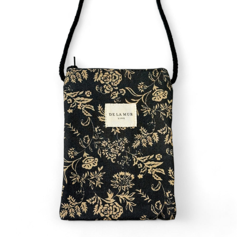 Bolsito porta móvil para llevar tipo bandolera, con cremallera en la parte superior y cordón largo de algodón de color negro. Con tejido fino con estampado floral en tonos beige y negro. Cada articulo puede tener una variación en el estampado, dependiendo de donde se haya efectuado el corte de la pieza. Forrado de tejido grueso de color gris en la parte interior. Para su correcto mantenimiento se aconseja lavarlo en frío a mano y no utilizar secadora.