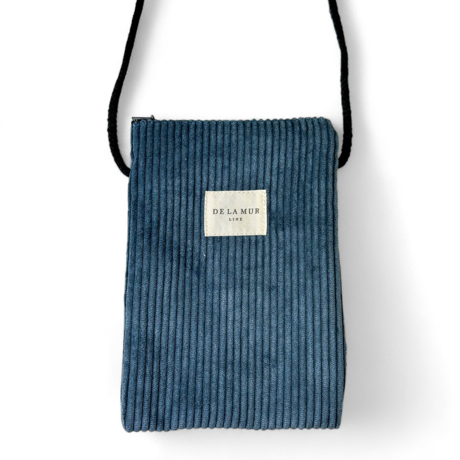 Bolsito porta móvil para llevar tipo bandolera, con cremallera en la parte superior y cordón largo de algodón de color negro. Con tejido grueso de pana azul. Cada articulo puede tener una variación en el estampado, dependiendo de donde se haya efectuado el corte de la pieza. Forrado de tejido grueso de color gris en la parte interior. Para su correcto mantenimiento se aconseja lavarlo en frío a mano y no utilizar secadora.