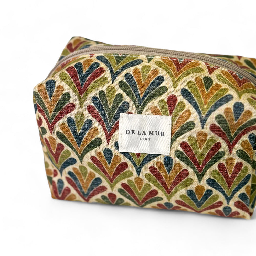 Neceser mediano con cremallera en la parte superior y con asa lateral. Con tejido fino con estampado geométrico en tonos beige y verde. Para su correcto mantenimiento se aconseja lavarlo en frío y no utilizar secadora.
