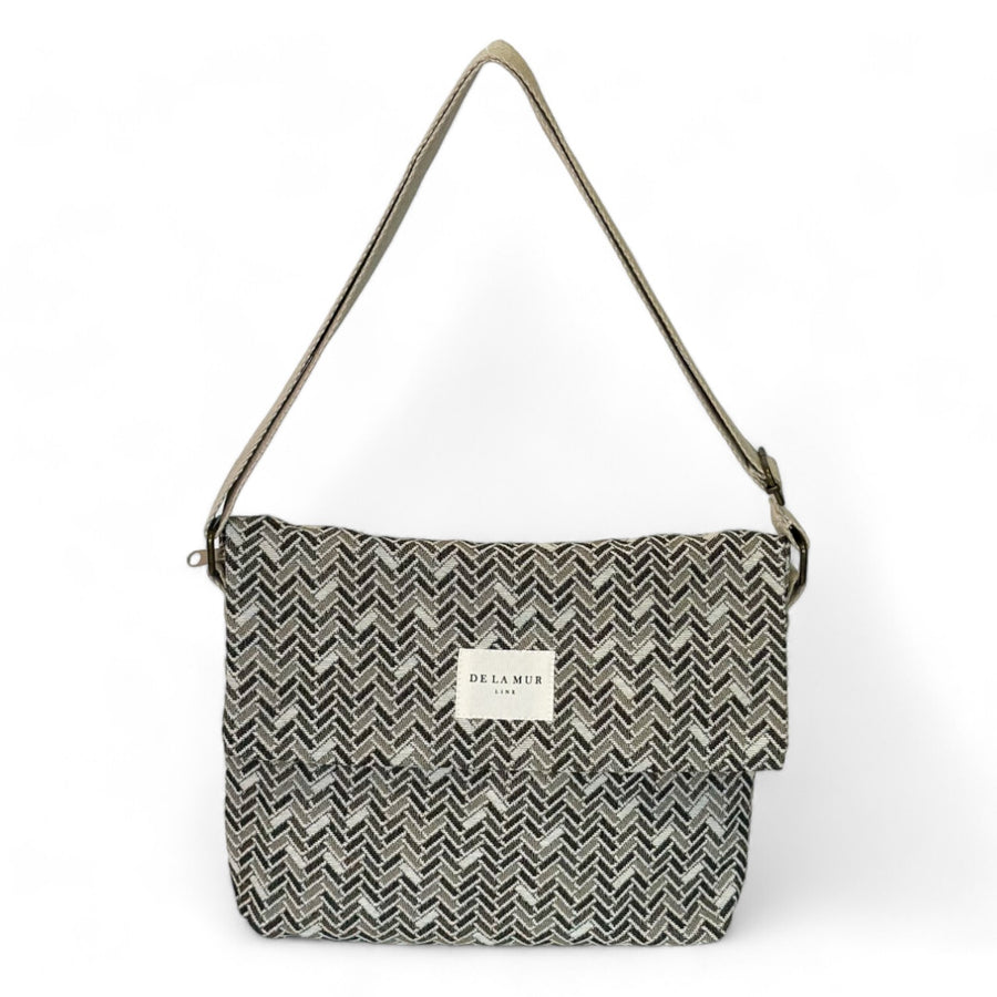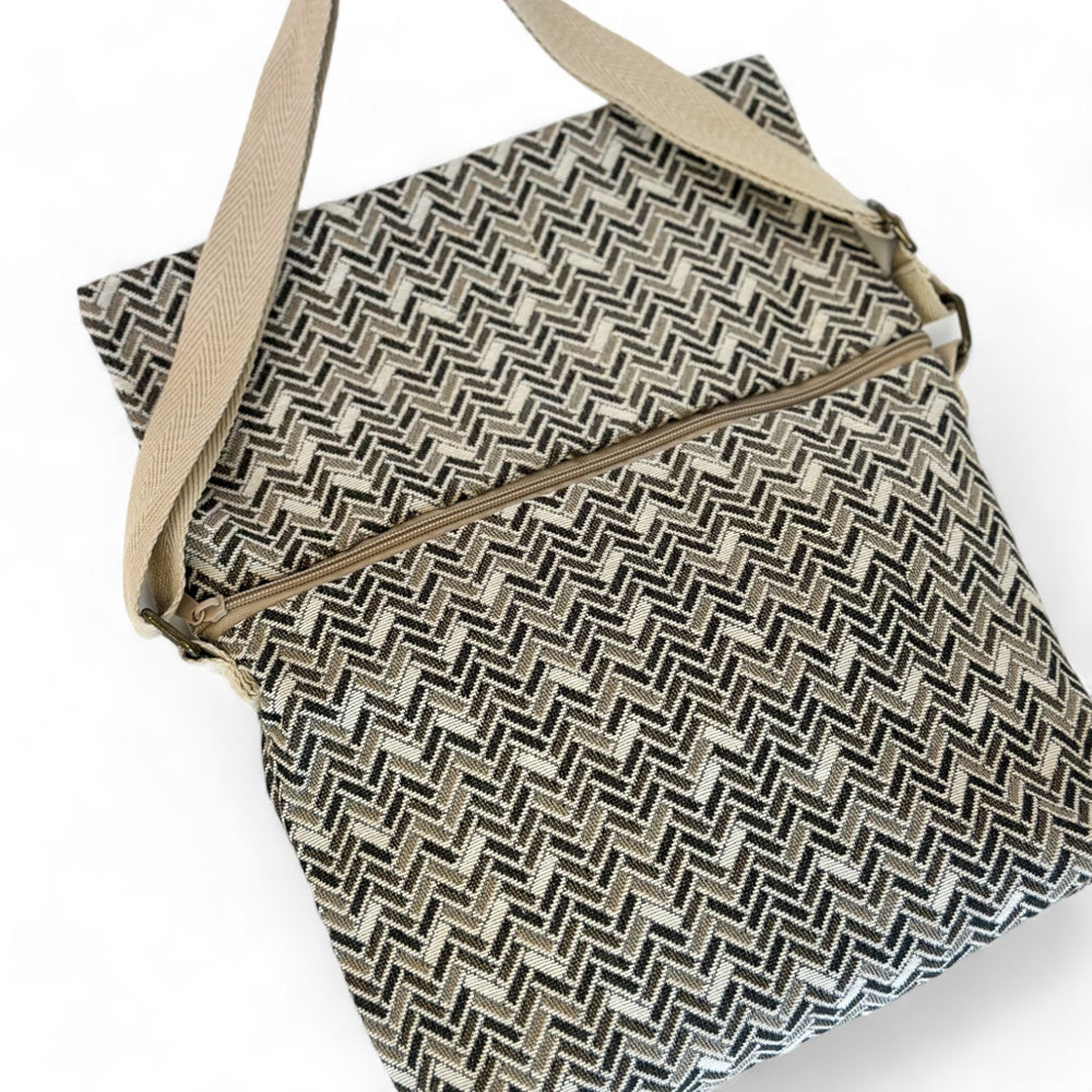 Bolso solapa mini tipo bandolera con asa larga ajustable de cinta de espiga de algodón de color beige. Con un tejido grueso de jacquard con estampado geométrico en tonos marrón. Cierre superior con cremallera. Bolsillo con cremallera exterior bajo la solapa. Forrado de tejido grueso de color gris en la parte interior. Bolsillo interior con cremallera. Para su correcto mantenimiento se aconseja lavarlo en frío a mano y no utilizar secadora.