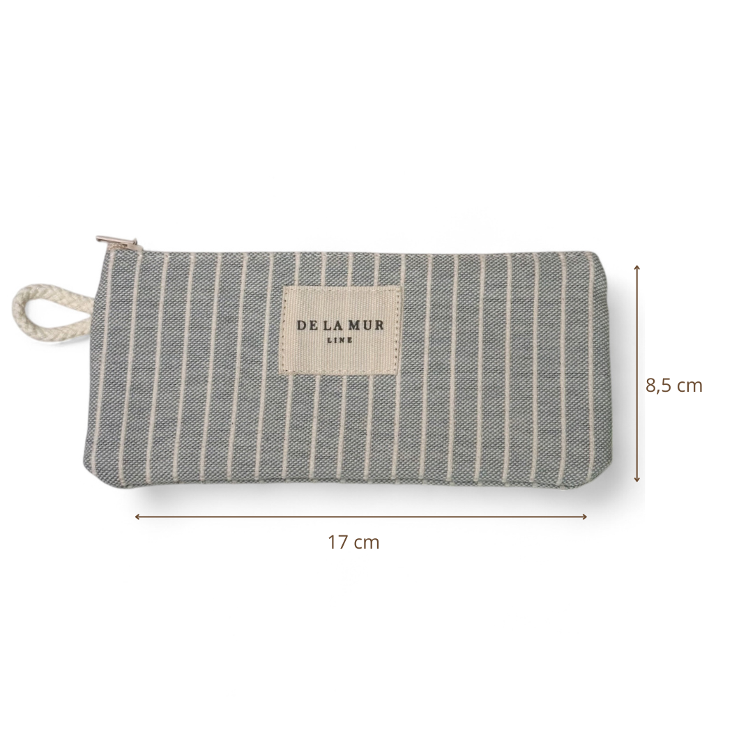 Funda de gafas con cremallera en la parte superior y pequeña asa de cordón de color crudo en el lateral. Con tejido fino con estampado a rayas de color crudo sobre fondo verde agua. Cada articulo puede tener una variación en el estampado, dependiendo de donde se haya efectuado el corte de la pieza. Forrado de tejido grueso de color gris en la parte interior. Para su correcto mantenimiento se aconseja lavarlo en frío a mano y no utilizar secadora.
