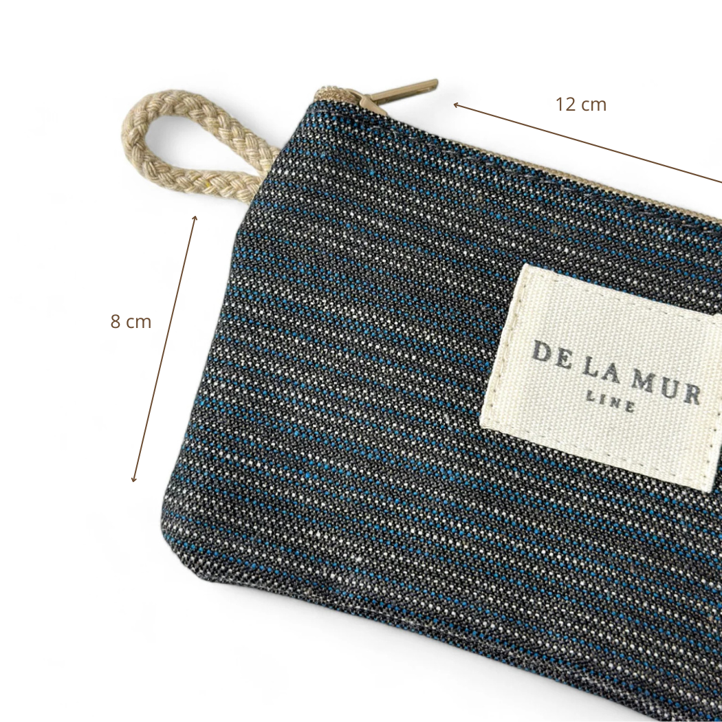 Monedero con cremallera en la parte superior y pequeña asa de cordón de color beige en el lateral. Con tejido grueso a rayas en tono azul oscuro y marrón. Cada articulo puede tener una variación en el estampado, dependiendo de donde se haya efectuado el corte de la pieza. Forrado de tejido grueso de color gris en la parte interior. Para su correcto mantenimiento se aconseja lavarlo en frío a mano y no utilizar secadora.