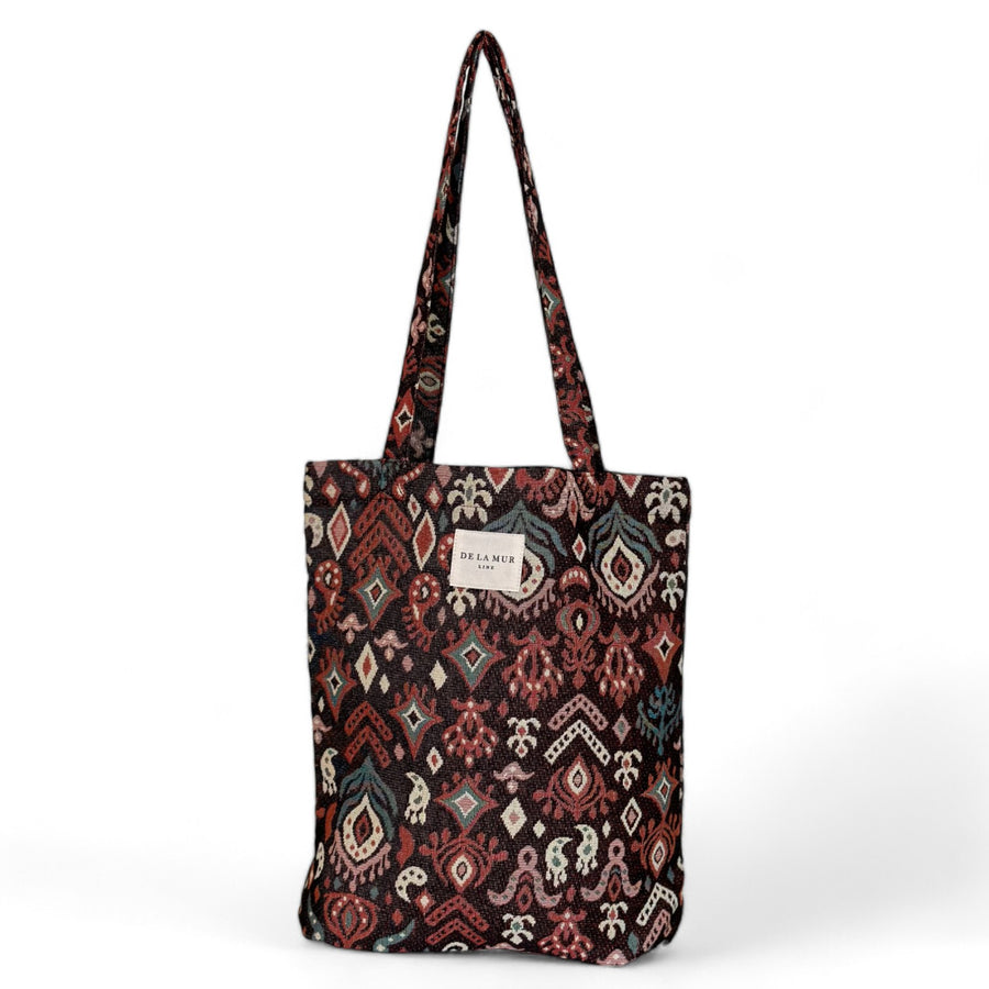 Bolsa “tote bag” con asas para llevar al hombro. Con tejido grueso de jacquard con estampado geométrico en tonos granate. Para su correcto mantenimiento se aconseja lavarlo en frío y no utilizar secadora.