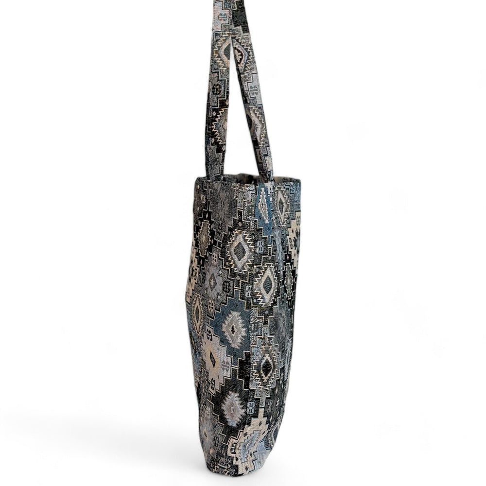 Bolsa “tote bag” con asas para llevar al hombro. Con tejido grueso de jacquard con estampado étnico en tonos azul y gris. Para su correcto mantenimiento se aconseja lavarlo en frío y no utilizar secadora.